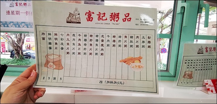 菜單粥品均一價28元澳門幣,加料+5元,雞蛋+5元,油條 8元,還可以加二圓澳門幣加藜麥。富記的及第粥、牛肉魚片粥、粉腸粥等等,都是人氣粥品。