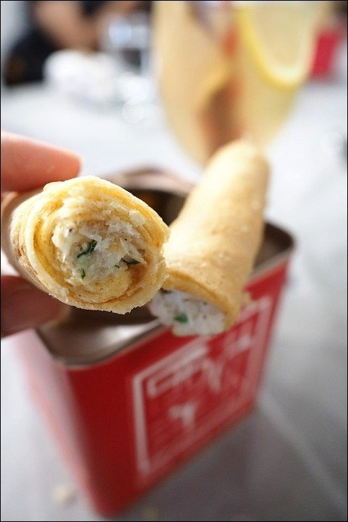 馬介休韃靼釀蛋卷,這道是澳門知名伴手禮蛋捲裡頭,放入澳門著名的馬介休(馬介休是葡萄牙長時間海上開擗世界,將魚制醃成「馬介休」所出現的食品),咬下去保有蛋捲的酥脆蛋香,搭配馬介休的鹹香,口感很有層次。