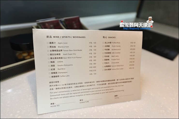 Mini Bar招待享用(特製迎賓飲料招待依季節做調整),冰箱冷藏上層是免費招待,下層需付費,我們入住時提供的特製迎賓飲料是淡水北海岸有名的檸檬石花凍,清涼消暑好喝!