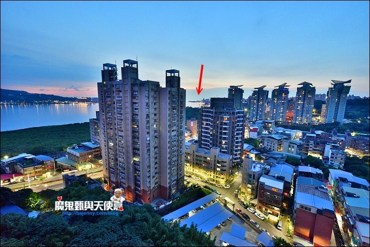我們入住的算是海景房,浴室和陽台都可以看到淡水山海景觀,幾棟大樓正中間最遠方紅色箭頭處就是漁人碼頭情人橋,基本上房間內就可以看到夕照。