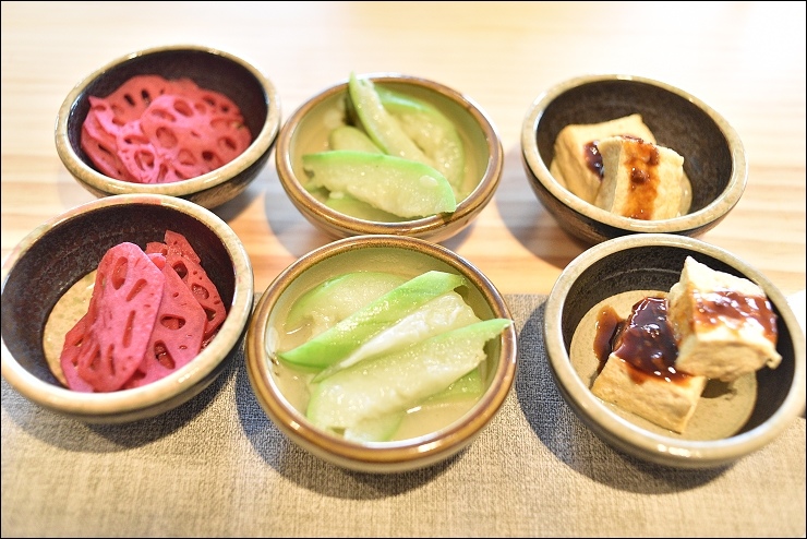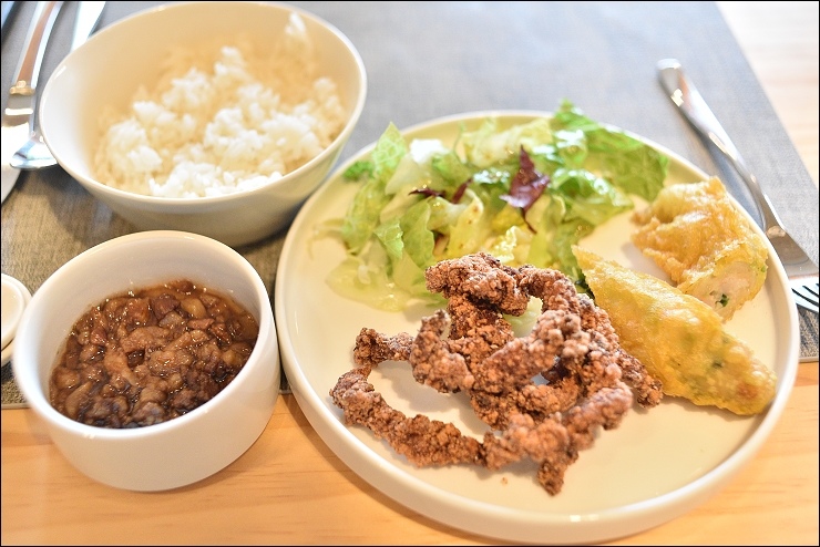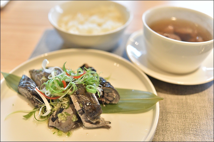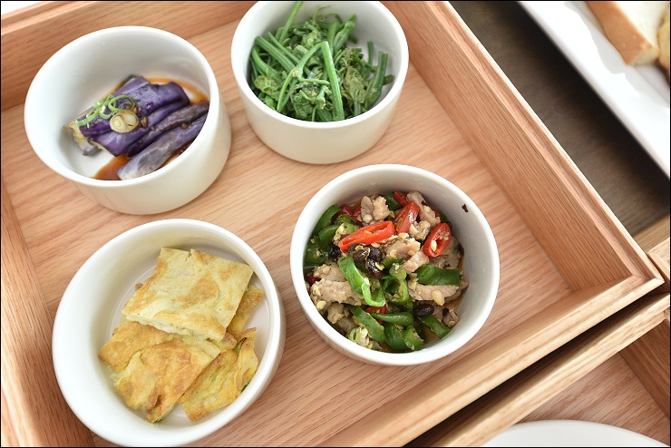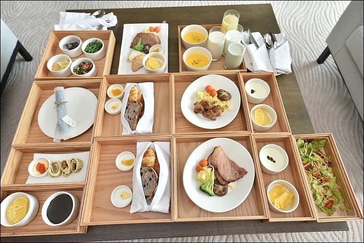 豐富的中西式早餐選擇, 主廚精選在地的小農食材, 中式蘊木盒熱粥配合的清粥小菜: 煎蛋、辣椒肉碎、茄子、當季蔬菜等很對胃口,旁邊有糯米腸和手作紫米飯糰捲 ; 西式提供新鮮健康的藜麥牛蒡絲蘊沙拉、匠心手作烘培強調五感體驗的麵包組合,搭配當季新鮮水果製成的的果醬及有榛果油及蕎麥脆的奶油,並供以選擇的飲品(白豆漿、鮮奶、美式咖啡、新鮮果汁)不僅美味且健康, 前晚選好送達時間後, 就會專人直送至房內使用。