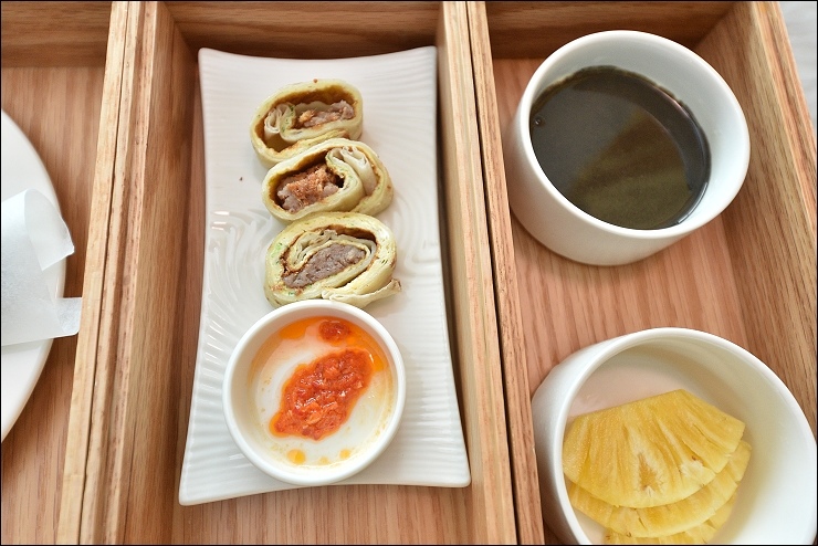 豐富的中西式早餐選擇, 主廚精選在地的小農食材, 中式蘊木盒熱粥配合的清粥小菜: 煎蛋、辣椒肉碎、茄子、當季蔬菜等很對胃口,旁邊有糯米腸和手作紫米飯糰捲 ; 西式提供新鮮健康的藜麥牛蒡絲蘊沙拉、匠心手作烘培強調五感體驗的麵包組合,搭配當季新鮮水果製成的的果醬及有榛果油及蕎麥脆的奶油,並供以選一的飲品(白豆漿、鮮奶、美式咖啡、新鮮果汁)不僅美味且健康, 前晚選好送達時間後, 就會專人直送至房內使用。