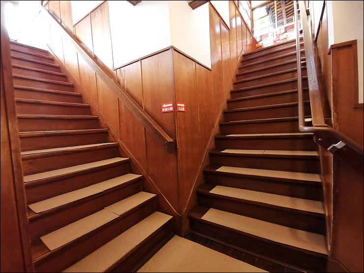 相馬樓的建築物有二百年歷史,還保有明治時代的玻璃窗,木地板踩起來有時還會吱吱叫,室內樓梯是櫻花樹幹做的扶手,少見的紅花色塌塌米,每個角落都是美景,整個很有味道!