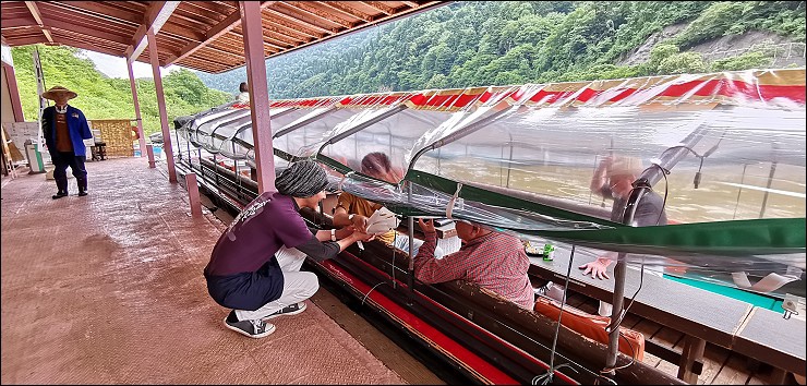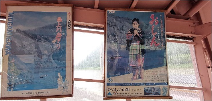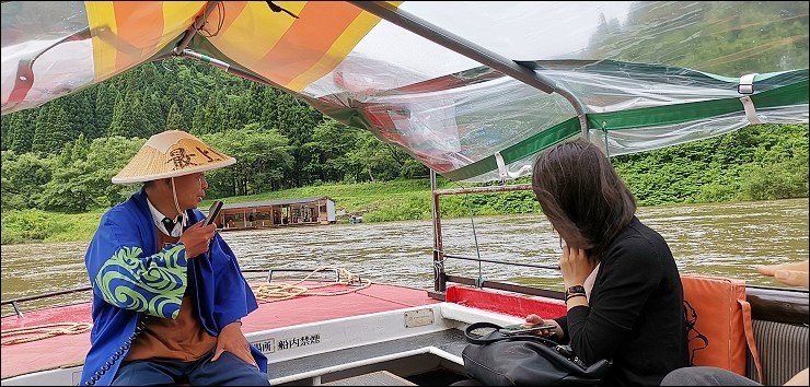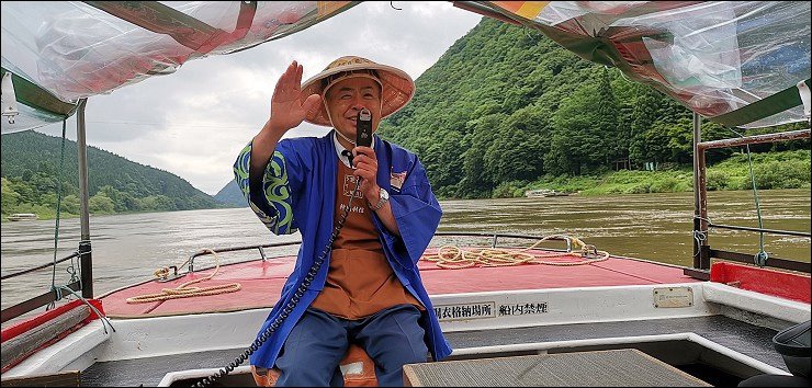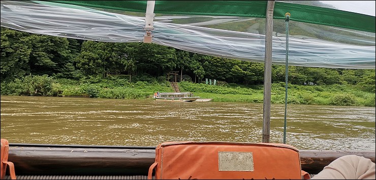 最上川是縱貫山形縣的河流,收視率破50%的日本連續劇「阿信」的劇中,最上川也是很重要的場景,年幼的阿信爲了到富人家中幫傭乘著木筏順流而下,她的父親依依不捨地追著船跑的情景讓人印象深刻。最上川最上峽芭蕉線觀光船體驗全長約12公里的最上川風光,最上川正常的水位最深14公尺深,平均深度三尺左右,大約50分鐘的船程航行中都有搭配一位船夫,船夫都是非常資深的導覽員,對於最上川的故事及周邊環境都很熟悉,比較可惜的是全程都只提供日文導覽。最上川四季分明,這次夏天來綠意盎然,聽說春天可看見櫻花飄落,秋天會看到紅了的山頭,冬天會有白雪的水墨畫,各有不同風情,我個人很想秋天或冬天再來感受。