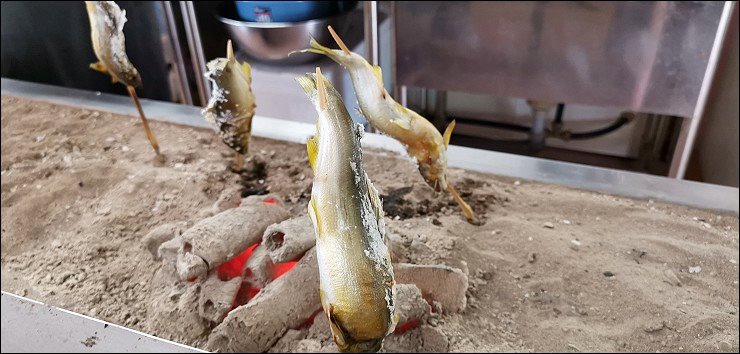 船夫興起也會來幾首日文歌,日本旅客一起打拍子合唱好有Fu,不懂日文歌我就只能感受氣氛囉。途中會停靠在一個河邊賣店,大家可以補給飲料或買個熱食吃一下,熟門熟路的日本旅客很厲害,不用下船直接在座位上點餐,沒幾分鐘現烤香魚就被買光,想吃的朋友動作要快,慢一步就買不到...在船上吃著現烤香魚配飲料,船夫還唱歌給你聽,好愜意呀!