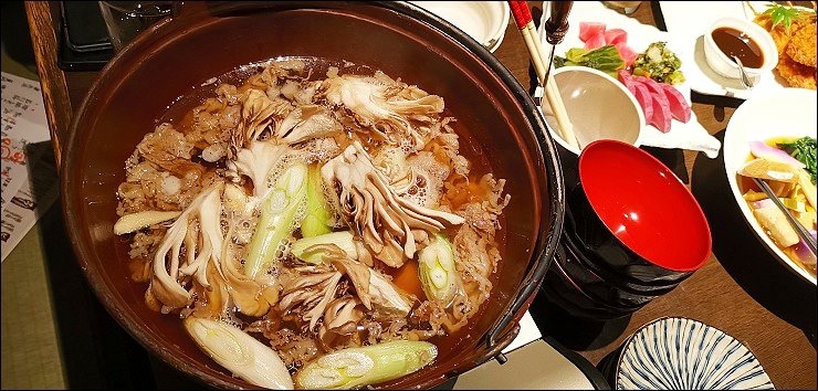 晚餐到山形車站附近品嚐地方鄉土料理,這一大鍋就是山形特色菜,放了不少菇類、山形牛肉片、蒟蒻、蒜曲等滿滿一鍋,湯頭微鹹但愈喝愈順口,生魚片、炸豬排、煎雞腿排等滿滿一桌吃起來好過癮。