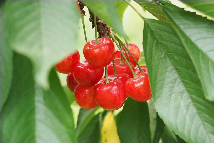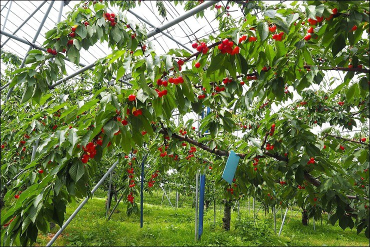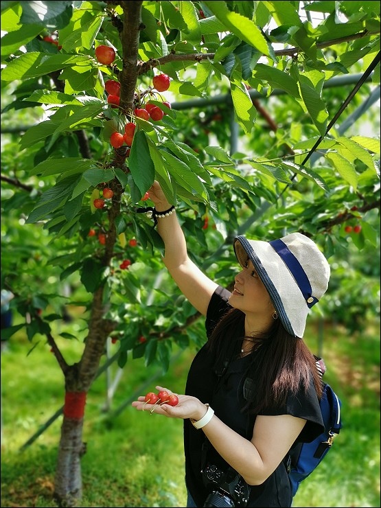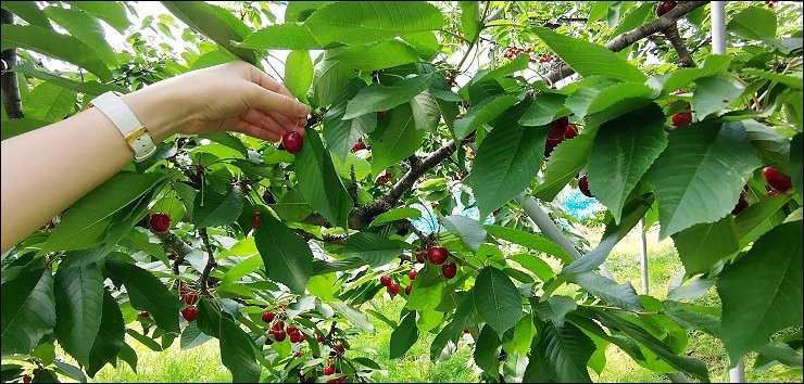 哇,這是我第一次看到櫻桃樹耶,而且結實累累的櫻桃,就像是一顆顆紅寶石,鮮紅迷人。這裡的櫻桃品種有山形美人、佐藤錦、紅秀峰等品種,櫻桃樹也有跟我們差不多高度,甚至是要爬梯子才摘的到的櫻桃樹。我們現採現吃,摘下來在身上擦一下就入口,隨地吐籽也無所謂,我喜歡皮有點脆的口感,有些熟度高的櫻桃口感會軟一點,甜度都很夠,新鮮的櫻桃都在這,愛美的我們一路狂吃嘴巴都沒在停,櫻桃營養多多,女生多吃會美美的!來這裡不用忙著拍照,認真吃夠本!