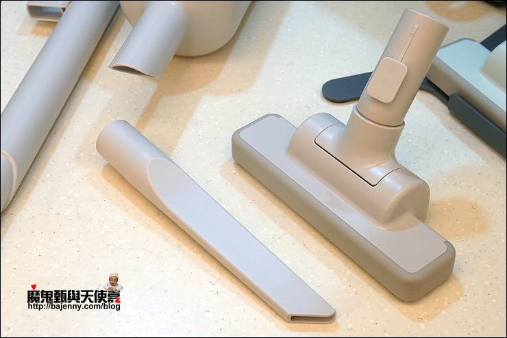 正負零吸塵器的標配就是兩種接頭,地板吸盤跟長管吸頭,這幾年掃地機器人很夯,我們也一直想嘗試,但最後一直沒有行動就是礙於家裡空間小雜物多,掃地機能服務的範圍其實不多,每晚吹完頭髮一地的落髮常常讓人厭煩啊雜,乾脆就直接將吸塵器放在吹風機旁,吹完就吸!!