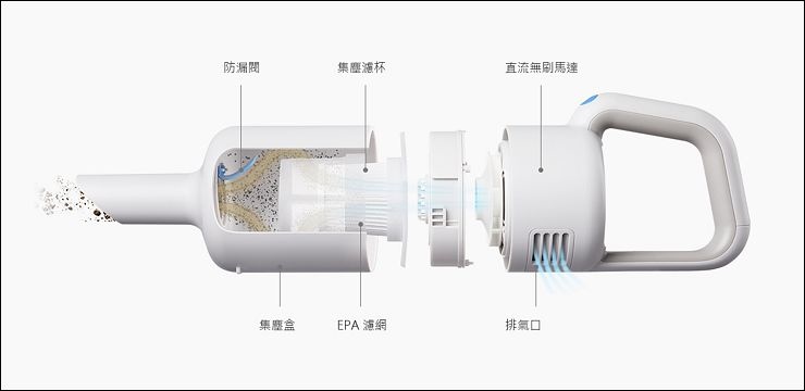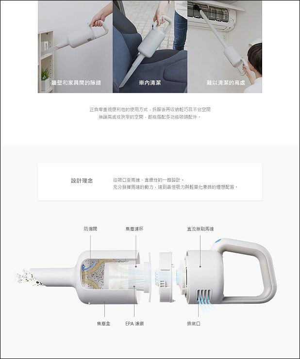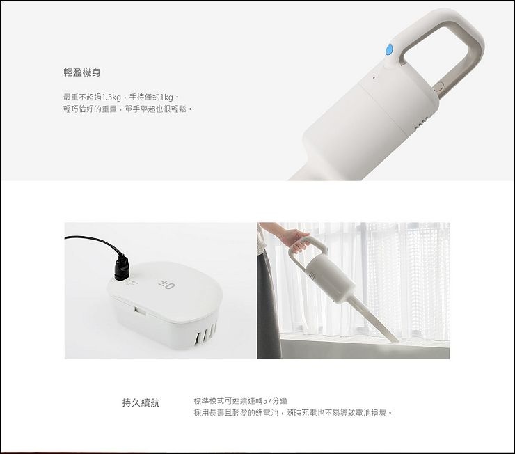 以前有線吸塵器的馬達加上機身都很重,正負零的機身手持只有1公斤,接上長管可以吸縫隙處、高處、紗窗軌道、拿去吸車子等,超輕量設計可以單手輕鬆用,難怪小孩子幫忙也不吃力,從此也愛上當爸媽的小幫手~~