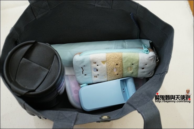 除了可以當小學生餐袋,我覺得更適合拿來當小資女午間外出的小提袋呢~~放隻97g傘、口袋風扇、保溫瓶、錢包等,就可以輕輕鬆鬆出去吃飯啦~~