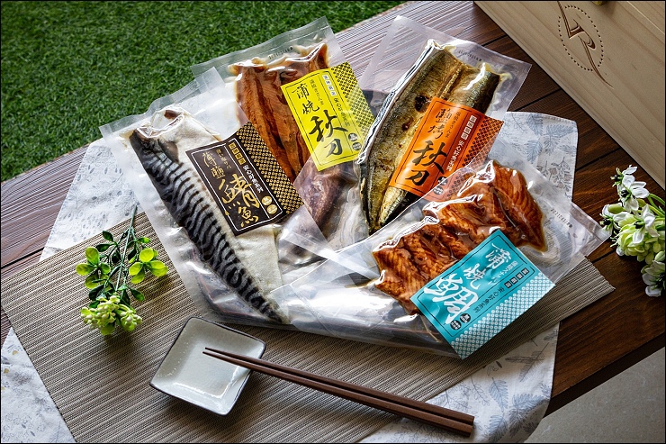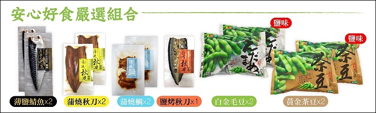 內容物:鹽烤秋刀 85g x1 / 鹽烤鯖魚 160g x2 / 蒲燒秋刀 110g x2 / 蒲燒台灣鯛110g x2 / 白金毛豆 400g x2 / 黃金茶豆 400g x2