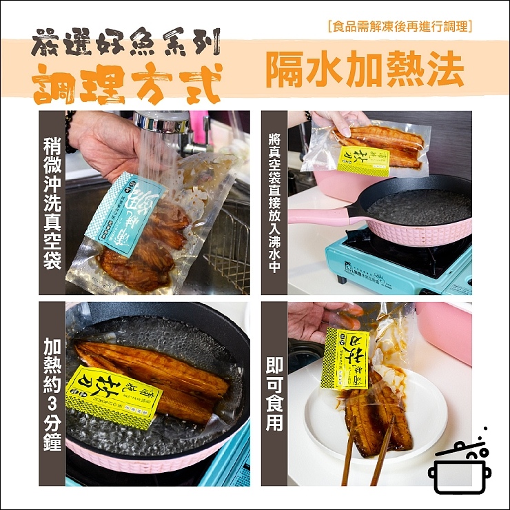 隔水加熱法:將真空袋直接放入沸水中加熱約3分鐘,即可食用