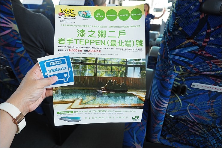 JR二戶站東口出站就看到定期觀光巴士岩手天邊號在等大家啦,司機會幫忙把行李放到行李置物區,上車後發行程表跟觀光巴士遊客貼紙,記得貼在服服上或包包上,方便辨識。