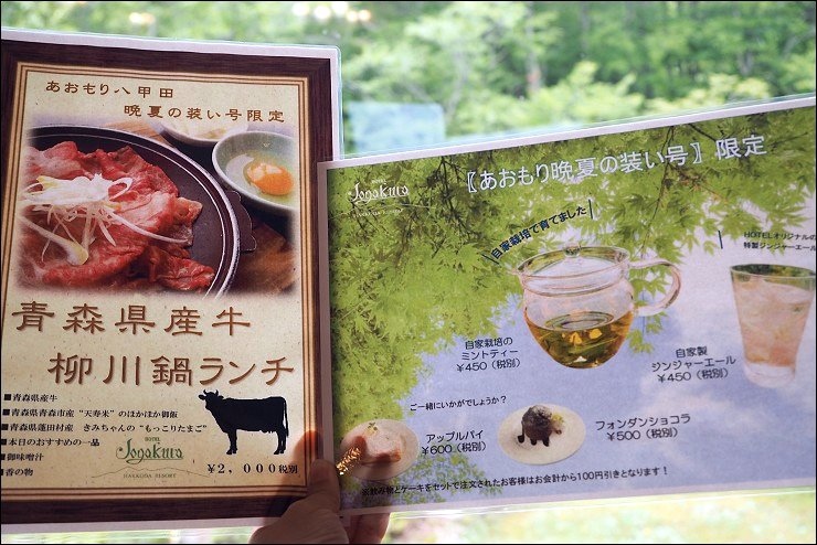接著搭巴士到城倉飯店 HOTEL Jogakura享用中餐,歐風建築很好拍照,城倉飯店 HOTEL Jogakura位於八甲田山櫸木森林中的城倉飯店,不僅鄰近奧入瀨溪流及十和田湖,飯店提供房客前往八甲田纜車、城倉大橋、酸湯的免費接駁巴士(五個人可以預約彈性時間,可接駁到青森空港),像我參加觀光巴士青森八甲田・晚夏風情號一日遊的旅客,可在城倉溫泉享用柳川鍋午餐,青森牛好吃耶!