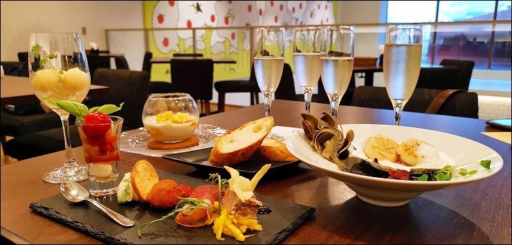 這天參加青森八甲田・晚夏風情號,專屬巴士載整路,喝到可以延年益壽的三杯茶、八甲田坐纜車看風景、品嚐美味柳川鍋及露天溫泉、和青森犬合照,回到青森飯店也才五點,正是夕陽西下之時,我們散步到附近逛逛,這裡有戶外區可以賞夕陽,裡面超多在地物買可,隨便買都達到退稅標準,大推蘋果汁,晴天霹靂米也是在地好米,友人也買了一大包回家啦,晚餐直接在這邊解決,吃到好吃的義式餐點,厲害的是它的蕦果酒,推薦可以點三杯蘋果酒或蘋果酒試飲品嚐看看。