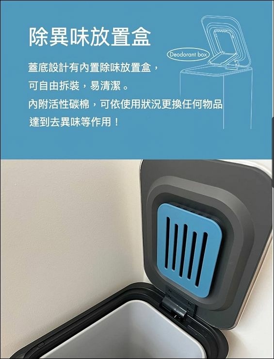 特別的是蓋底設計有內置除味放置盒,可自由拆裝易清潔,內附活性碳棉,可依使用狀況更換任何物品,達到去異味等作用!