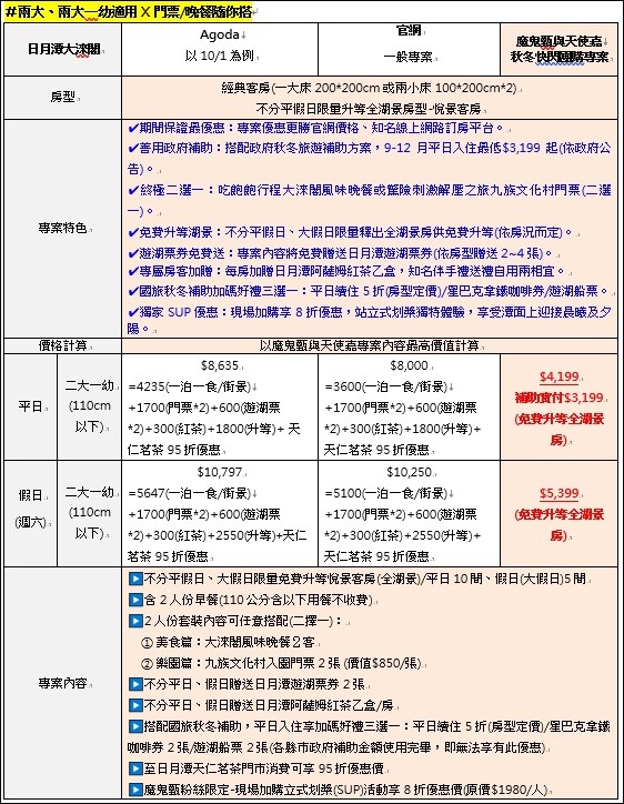 大家許願很久的日月潭大淶閣終於趕在秋冬補助成功開團啦!說到我們家日月潭必住飯店,除了定位較高的雲品和涵碧樓,再來就是這間地點極佳的高CP值日月潭大淶閣,無敵湖景、遊湖碼頭和商圈核心都在日月潭第一排!!! 面日月潭湖景第一排:享有絕佳視野,網稱唯一可180度欣賞日月雙潭日出和黃昏的飯店;緊鄰日月潭商圈第一排:每次開車進日月潭商圈就會先看到大淶閣,大門出去就是小吃街,各式小吃、餐廳和伴手禮專賣店都有,不怕買不到宵夜吃;座落水社碼頭第一排:離水社碼頭50公尺,走路不用5分鐘,搭遊艇遊湖、前往伊達邵碼頭交通最便利。這次的日月潭大淶閣秋冬補助限時快閃團,按照慣例專案優惠更勝官網和AGODA,★搭配政府秋冬旅遊補助方案,9-12月平日入住最低NT$3,199起(依政府公告為主);還有終極二選一:贈送吃飽飽行程大淶閣風味晚餐或驚險刺激解壓之旅九族文化村門票(二選一);★免費升等湖景:不分平日、假日、大假日限量釋出全湖景房供免費升等(依房況而定);★遊湖票券免費送:專案內容將免費贈送日月潭遊湖票券(依房型贈送2~4張);★專屬房客加贈:每房加贈日月潭阿薩姆紅茶乙盒,知名伴手禮送禮自用兩相宜;★國旅秋冬補助再加碼好禮三選一:平日續住5折(房型定價)/星巴克拿鐵咖啡券/遊湖船票;★獨家SUP優惠:現場加購享8折優惠,獨特的站立式划槳體驗,享受在潭面上迎接晨曦及夕陽。