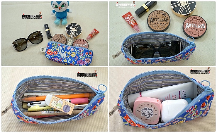 這次筆袋共兩種花色,採水餃形的開口容量較大,除了可以當筆袋,當然也可以當化妝包,連太陽眼鏡也都可以裝得下。