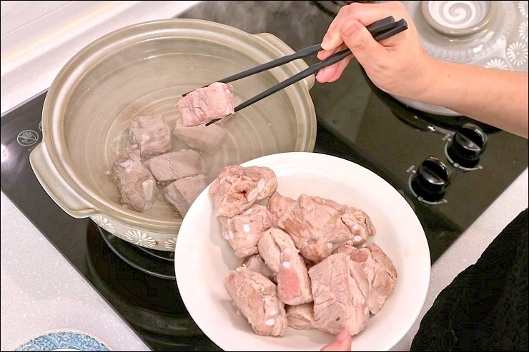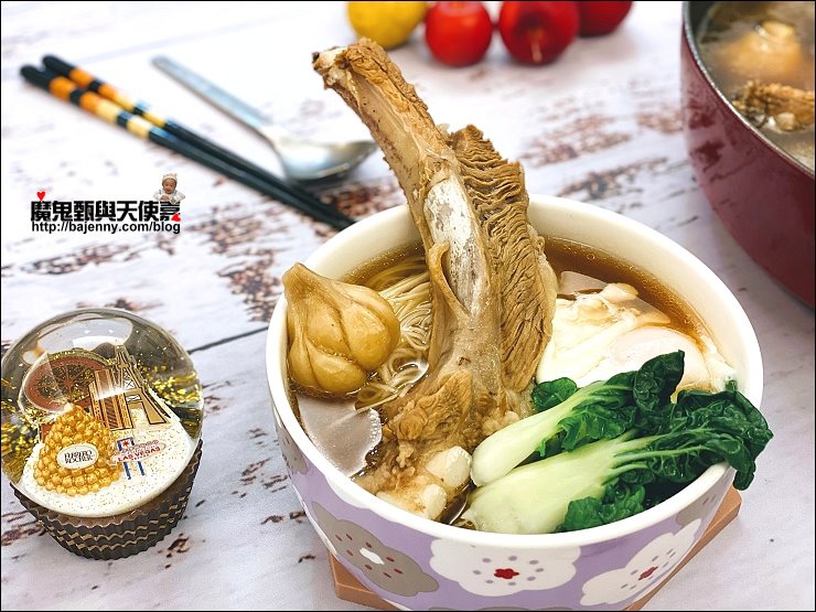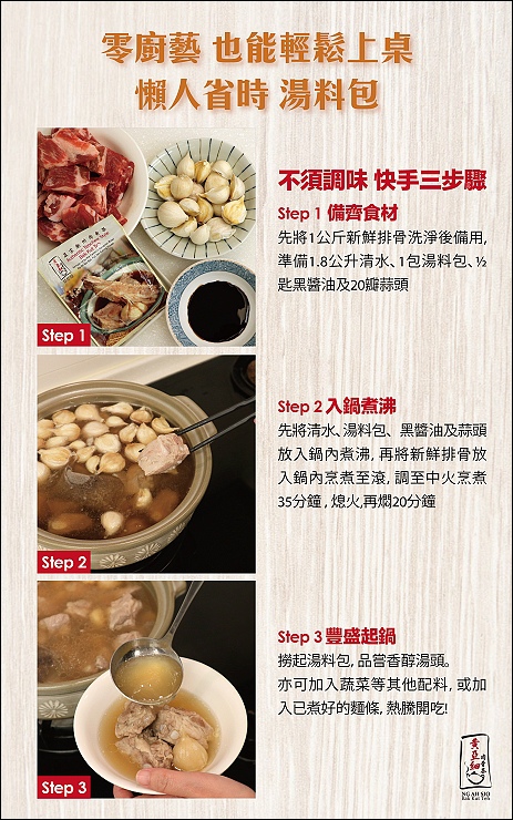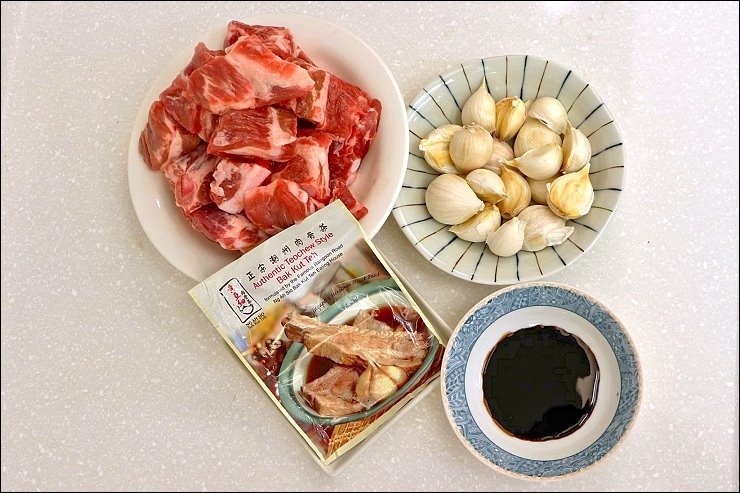 先將1公斤新鮮排骨洗淨後備用,準備1.8公升清水、1包湯料包、 ½匙黑醬油及20瓣蒜頭