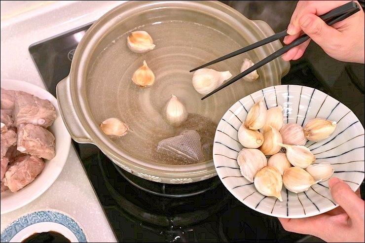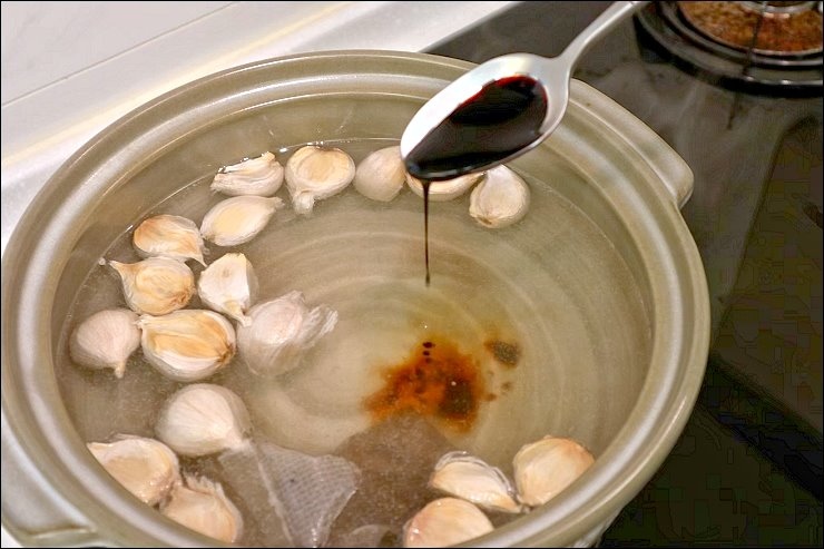 先將清水、湯料包、 黑醬油及蒜頭放入鍋內煮沸