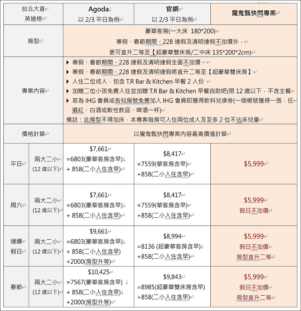 連大直在地人也來社團許願想住的台北大直英迪格酒店全新開幕獨家首賣來啦! #寒假平旺假日連續假日過年期間全部不加價!!允嘉大哥列為今年最強飯店早餐為了早餐來住都值得!!!松山機場轉捷運二站即達(國際觀光客最愛),直接住在大直美麗華百貨影城商圈,捷運劍南站步行約五分鐘,覓食逛街敗家蹓小孩超方便!還可以搭個摩天輪看台北101都會夜景,全台最難訂位RAW就在隔壁棟,周邊多家米其林和知名高檔餐廳,家庭節日慶祝和孝親住宿首選。環山傍水山河共棲,鳥大叔說窗外的山景會讓人忘記是住在都會還是渡假飯店(就是捷運車廂來來去去露了餡),鄰近大佳河濱公園和國立故宮博物院(車程十分鐘內),附近還有劍南蝶園(曾是軍事管制的保安林地)和金面山周邊知名景點不少,過年春節花季進攻陽明山賞花也很方便XD,這次的台北大直英迪格酒店全新開幕獨家首賣,按照慣例優惠內容更勝官網、知名線上訂房平台。★全面假日不加價:宿期每週六不加價外,更橫跨寒假、春節、228連假及兒童節清明連假皆不加價。★全面房型升等:不分平日、假日,入住免費升等至豪華客房 (12坪/ 一大床) 。★連假連升二級:農曆新年、228連續假日、及兒童節清明連假免費連升等2等至超豪華雙床房。(此房型全館共六間)。因方案過於優惠受限於飯店集團價格設定,這次將採電話訂房方式,填寫google表單由飯店訂房人員依序主動聯絡,或直接致電飯店02-35187777,並主動告知「魔鬼甄方案」即可。寒假過年期間想進台北城渡假夜市吃透透、故宮看展至善園餵魚和陽明山賞花的團員,熱門日期請先搶先贏,寒假過年好好渡假休息XD