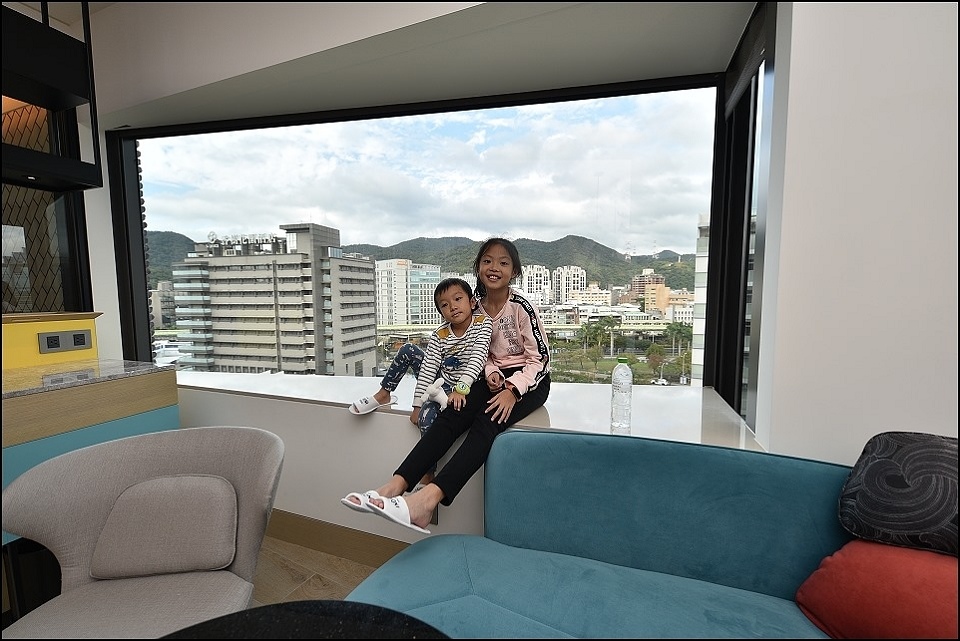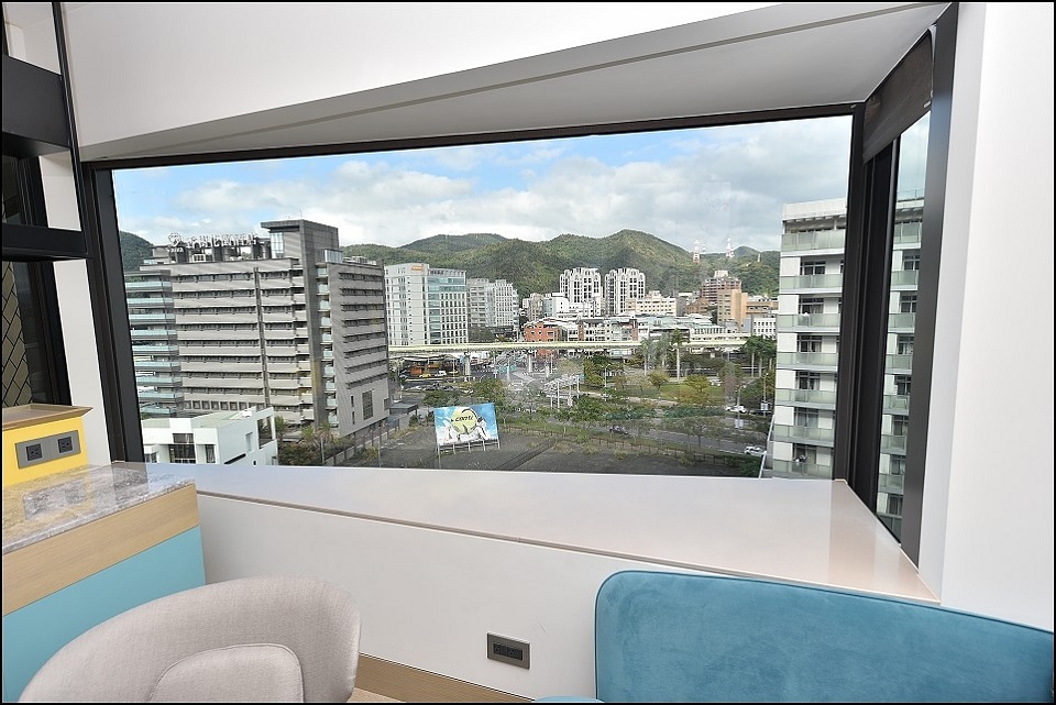 專案全面升等房型:不分平假日免費升等至豪華客房(一大床180*200cm),免費升等的豪華客房入住實拍,環山傍水山河共棲,鳥大叔說窗外的山景會讓人忘記是住在都會還是渡假飯店,就是捷運車廂來來去去露了餡,特別的三角窗陽台外推設計讓空間感和視野都有提升,小朋友很喜歡坐在這兒看著捷運跑來跑去,晚上睡覺時電動窗廉的遮光效果也很不錯。因鄰近大佳河濱公園和國立故宮博物院(車程十分鐘內),附近還有劍南蝶園(曾是軍事管制的保安林地)和金面山周邊知名景點不少,過年春節花季進攻陽明山賞花也很方便XD
