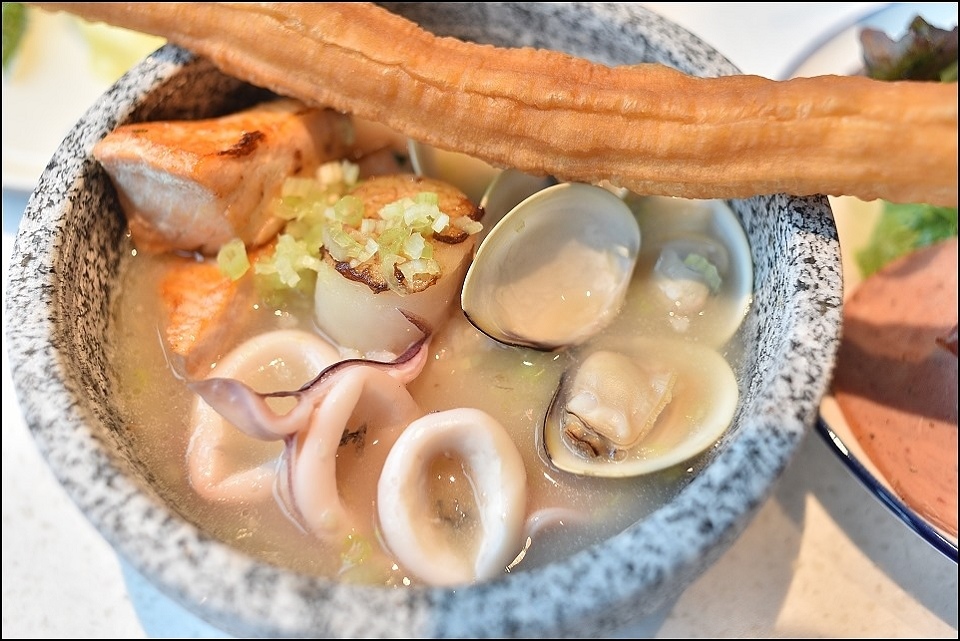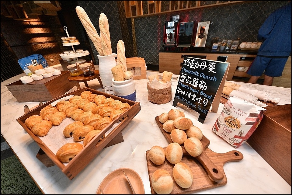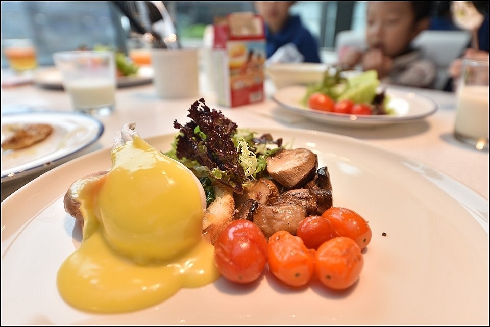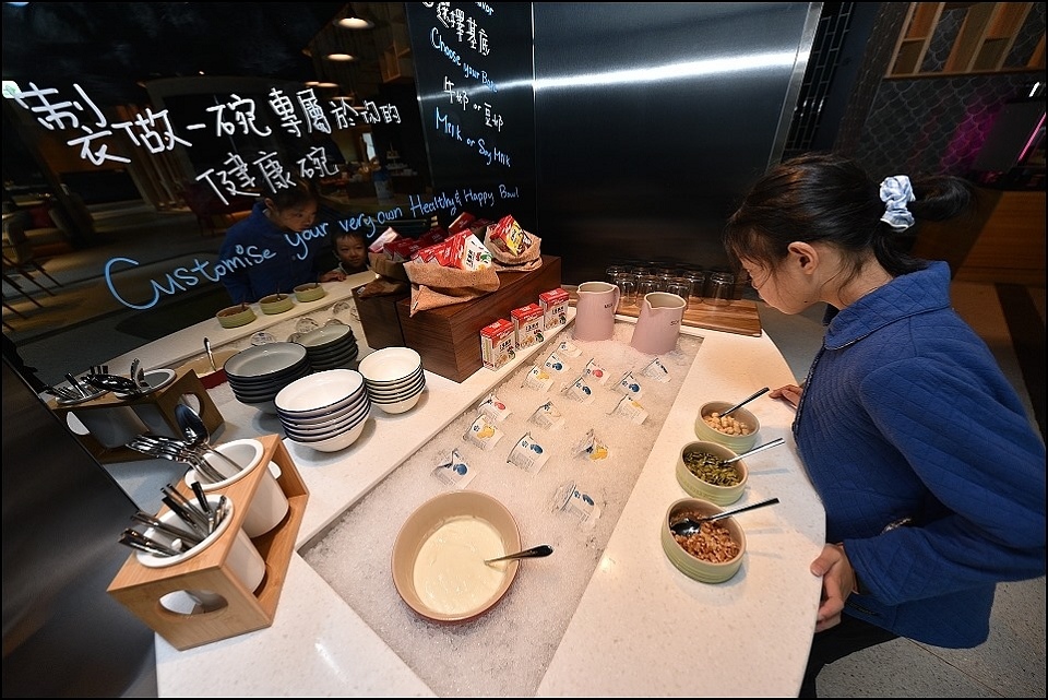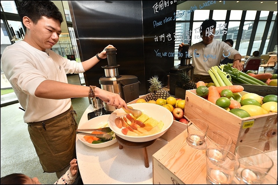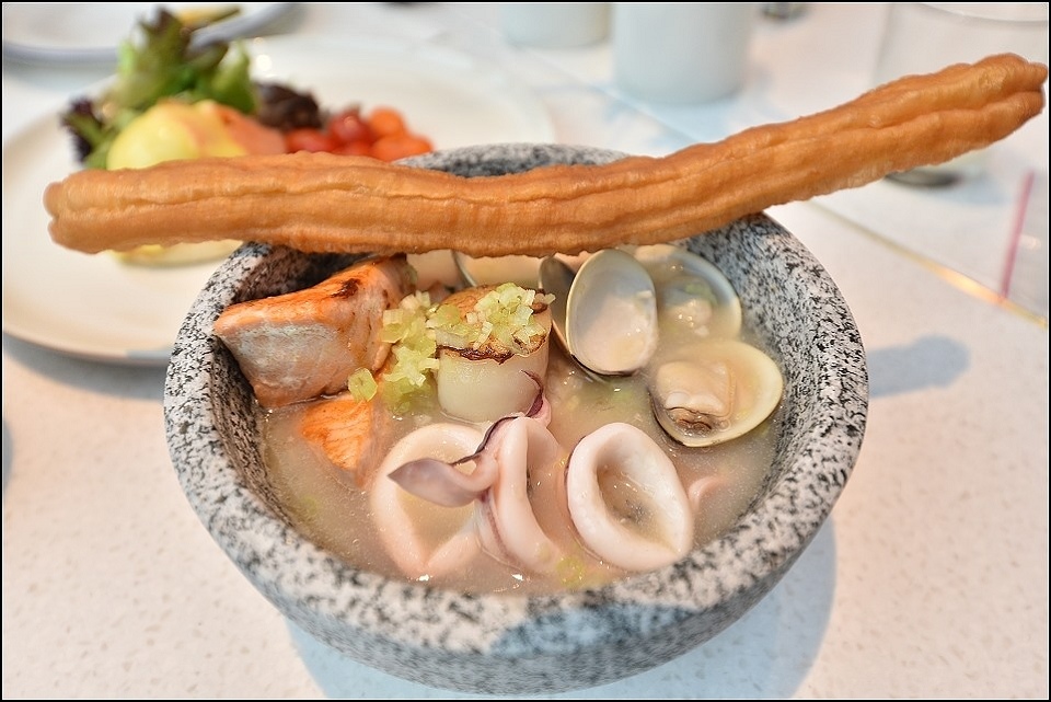 台北大直英迪格酒店的早餐被允嘉大哥列為今年最強飯店早餐,允嘉大哥說為了早餐來住都值得,主餐澎湃半自助BUFFET精緻,小姑選的主餐是螃蟹熬製高湯底的海鮮粥,上面舖了滿滿的新鮮大蛤蠣+現煎鮭魚+澎湖小卷+加拿大干貝(米是用台灣台梗米熬製),這碗在台北城內單點應該要價好幾百XD,另外早餐的自助大型榨汁機也很強大,百分百蘋果汁、哈蜜瓜汁喝起來都很奢侈啊~~