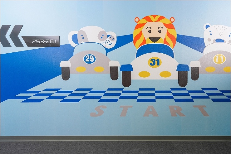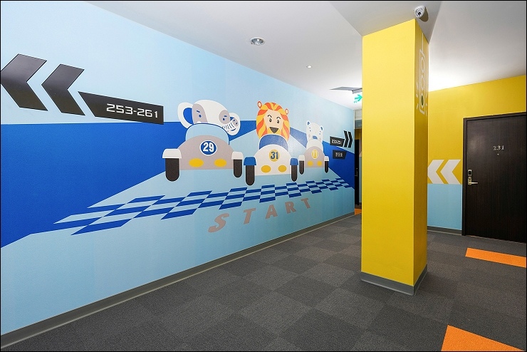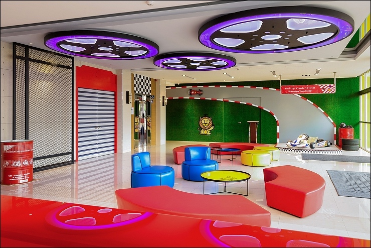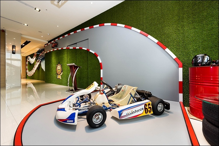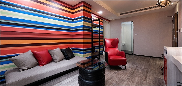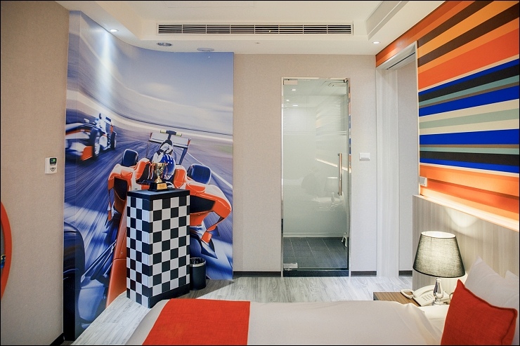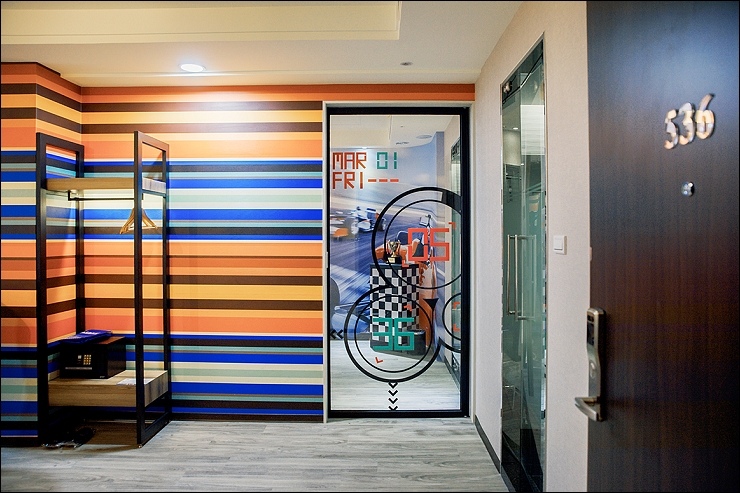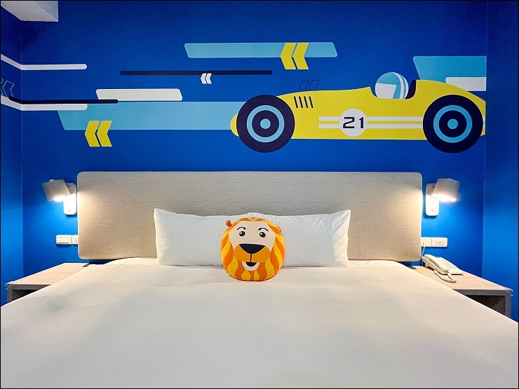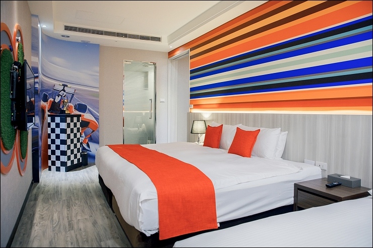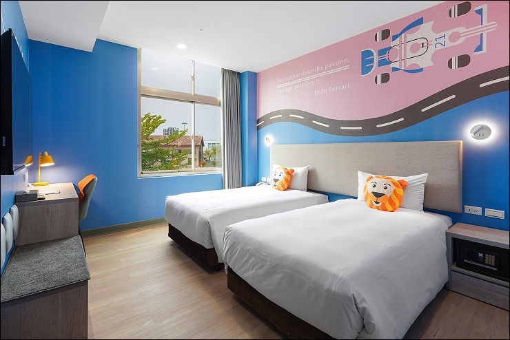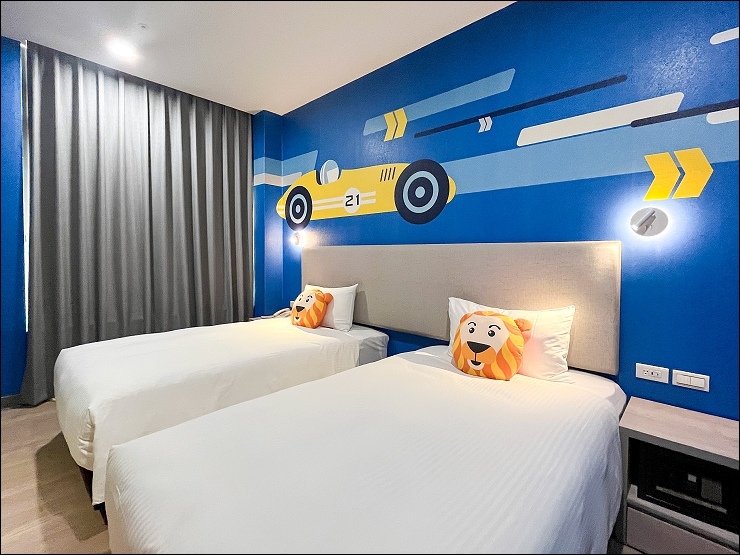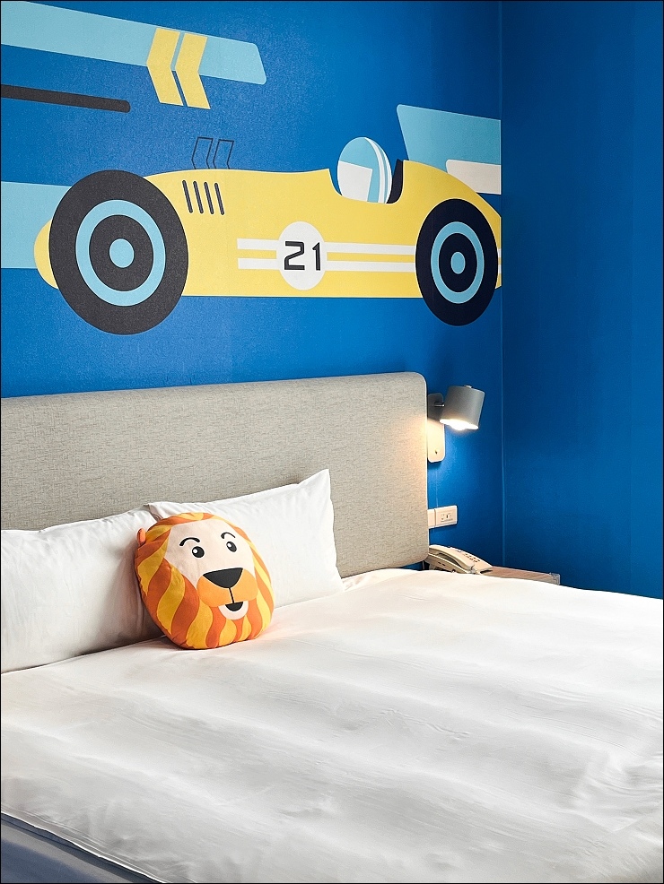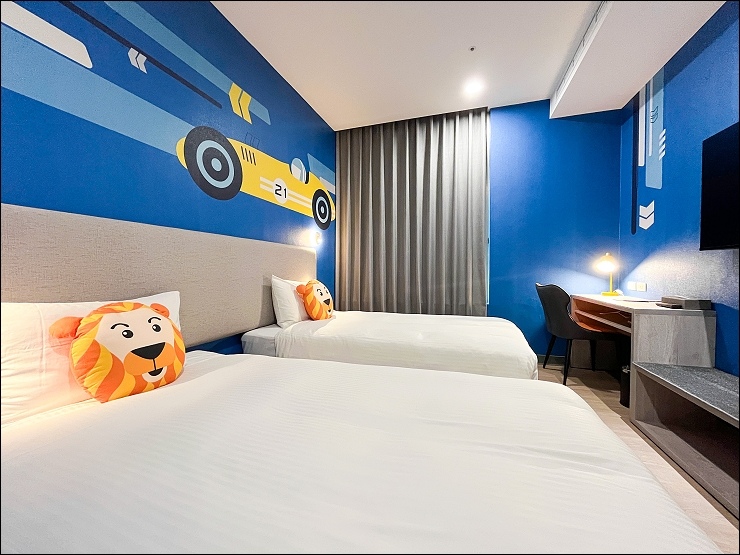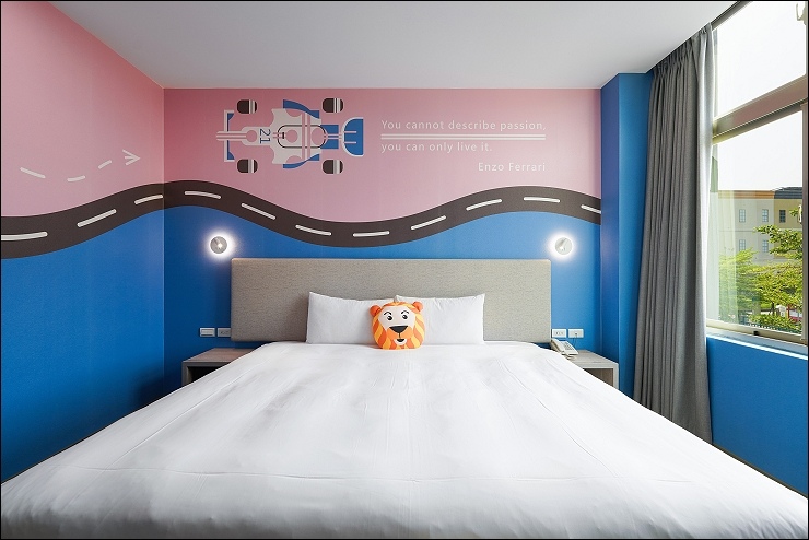 賽車親子套房:約17坪,以賽車畫面與頒獎台模擬出實境氛圍,一大床+一臥榻