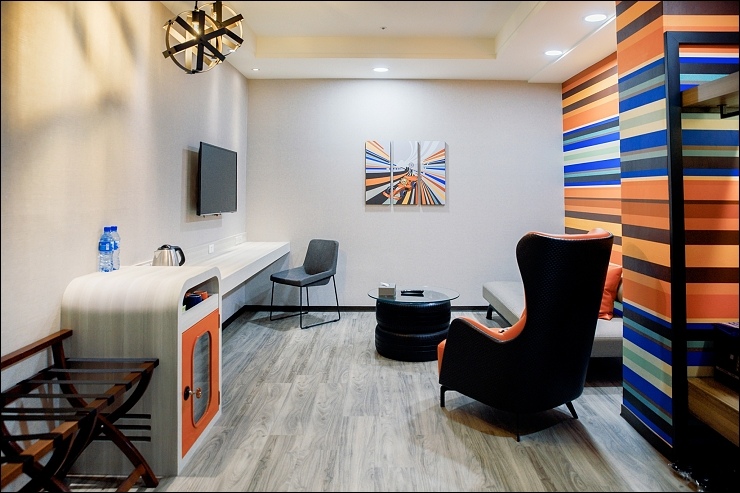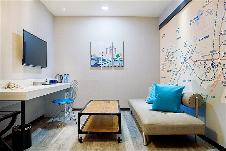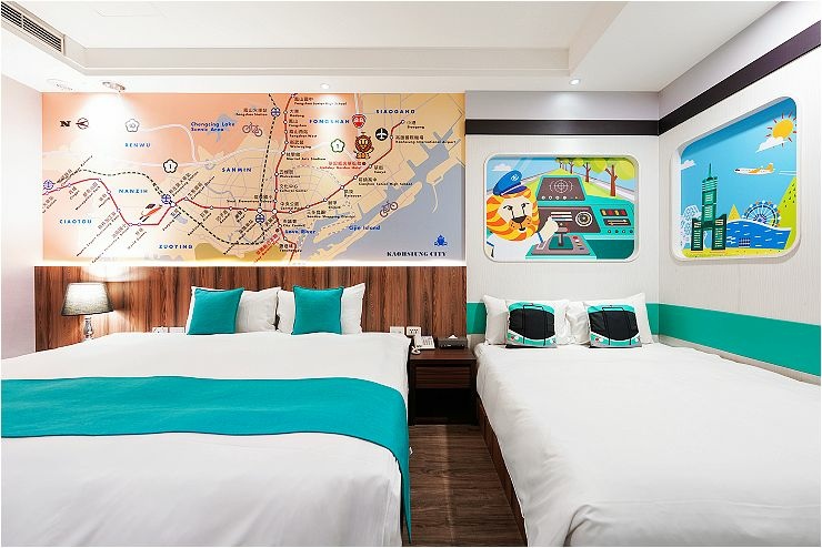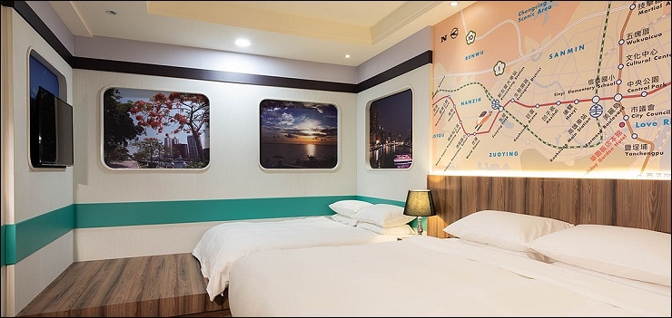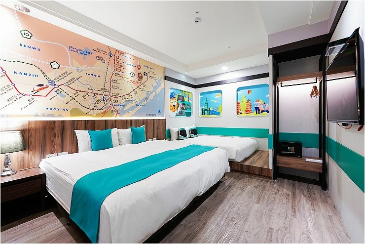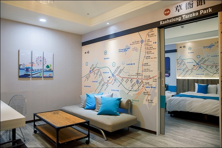 捷運親子套房:約15坪,融合高雄捷運車廂設計元素,一大床+一臥榻