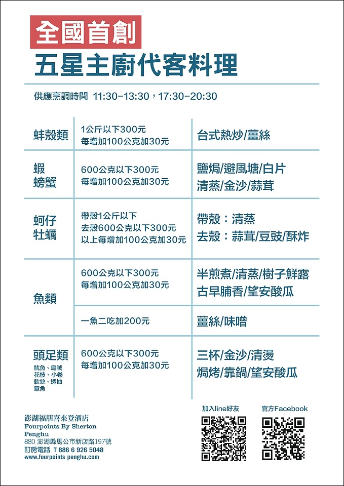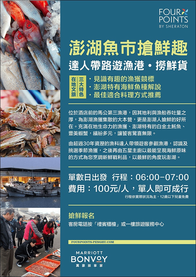 備註:來澎湖吃海鮮是最好在地行程之一,這次專案有贈送澎湖魚市體驗活動,見識有趣的漁獲競標,可以看看特別的漁種說明,更可以買回來後請五星主廚代客料理(依重量而計價)。