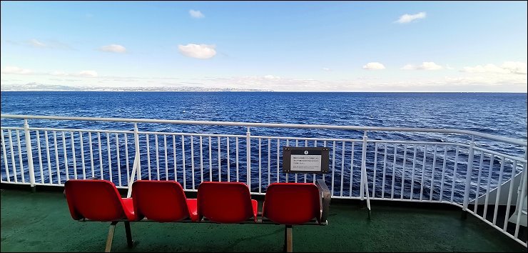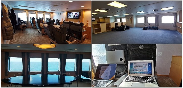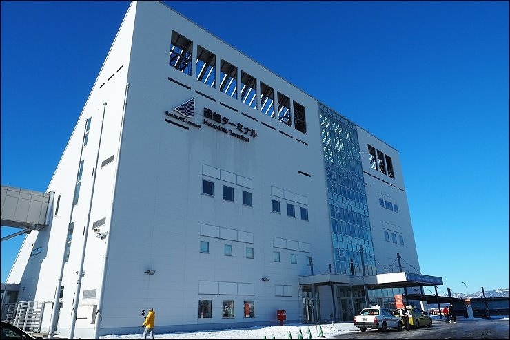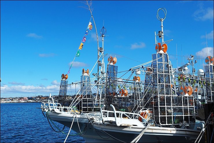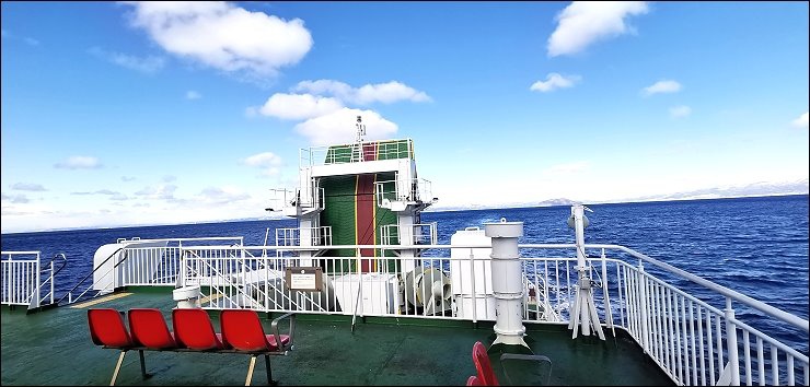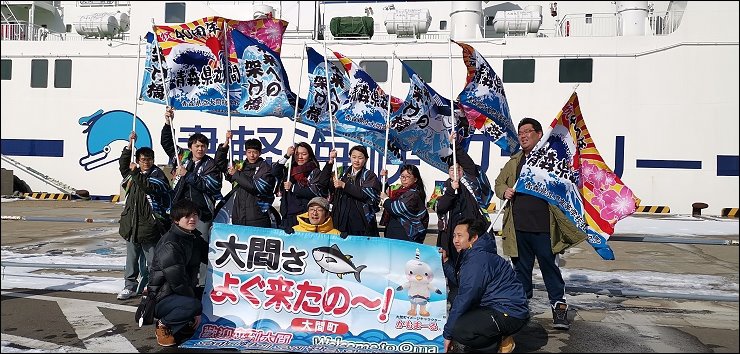 美味海鮮丼早餐享受完畢,接著前往這次旅行重點之一的大間町,位於本島最北邊。從函館到大間最快的方式是搭渡輪「大函丸」穿越津輕海峽,大約一個半小時就到大間港,來回函館與大間的大函丸每天兩班(早上下午各一班),我們搭早上九點半的船班,11點就可到大間港。大函丸全長約 91 公尺,底層可載 21 台貨車或小客車 60 台,客艙分為上下兩層,從乘船口前往客艙還有自動手扶梯。客艙有開放式空間的標準客艙(Stand),乘客可以坐著躺著睡都行,另外也有悠閒客艙(Casual)、特等客艙(First),我們買船票時買悠閒客艙,只有二十個皮製座位,另外還有更高級的特等客艙。我最怕坐船沒網路可用@@九函丸船上提供免費無限網路,訊號還不錯耶,我跟另一位3C重度使用者同行,我們就定位後就開電腦連網路工作啦,可到甲板上欣賞海上風光,有設座位讓遊客可以坐在戶外吹風看海,津輕海峽的海水流速非常快,深藍的海色很美,不過海上風大,提醒大家要記得戴上保暖衣物,如帽子、圍巾哦,夏天甲板上的遊客比較多!下船前就看到大間港熱情的高中生揮旗歡迎大家。