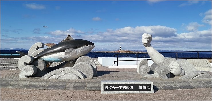 下北半島位於青森縣的東北邊、日本本島的最北,幾乎四面環海,大間町是日本相當知名的一本釣黑鮪魚(用釣竿釣鮪魚),這裡的海域因有多條洋流匯聚,得天獨厚的地形讓這裡的烏賊以及沙丁魚特別肥美,在成為黑鮪魚的佳餚後也讓黑鮪魚的油脂更為豐厚。一般灑網捕魚時,魚群為了逃脫而奮力掙扎,所以魚會遍體麟傷,而黑鮪魚光滑的皮膚只要稍微摩擦就會流血,一旦血液流到體內就會讓肉質產生變化,所以一本釣的方式就是為了不傷及掙扎中的黑鮪魚皮膚,讓肉質能保持在最新鮮的狀態,因此「大間黑鮪魚」已經被登錄為商標,只要是重量達到 30 公斤以上就會貼上「大間黑鮪魚」貼紙哦!想追求極緻的黑鮪魚是什麼滋味,來大間就對了!
