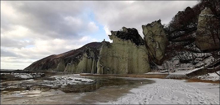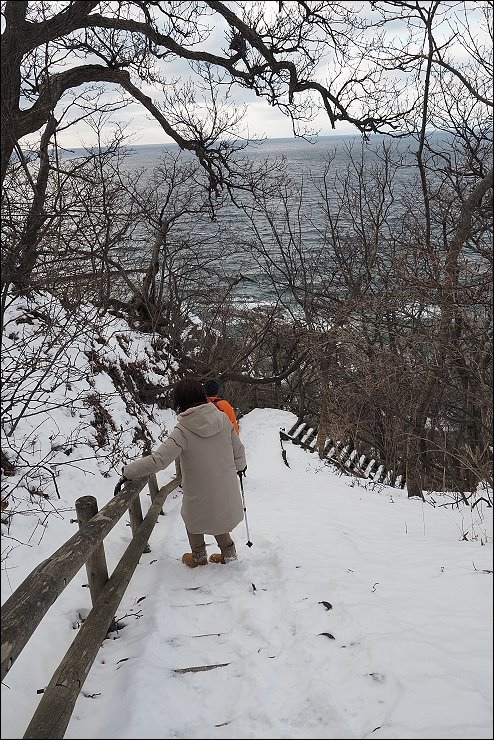 滿肚子的美味大間鮪魚之後,我們開往著這次讓我很期待的「佛浦」前進,車程約一小時,順著海岸線前進,在車上可看看窗外景色或小睡片刻。來這的前一晚下過大雪,從樹林裡走往海邊的路不太好走,建議要穿防滑的雪鞋及備好手杖,一步一步慢慢走,往秘境探險去!