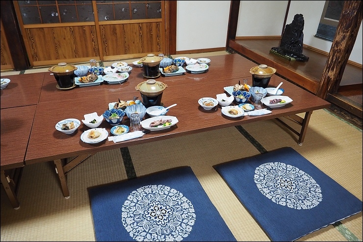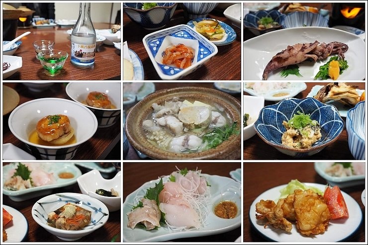 傍晚入住まるほん旅館,晚餐預訂1~3月期間限定的鮟鱇魚大餐,份量很多,有鮟鱇魚湯、生魚片、鮟鱇魚肝,炸鮟鱇魚、烤魚、等等料理,、榻榻米的房間乾淨舒適,上廁所及洗手枱則是要到房間外公共使用,旅館有提供男湯女湯的公共浴場,不過空間沒有很大。旅館對面有一間在地人喜歡的澡堂,我們當然也在晚餐飯店去泡了一回,洗澡泡湯都是日本人沒有觀光客,在地的婆婆媽媽在這裡刷背泡澡好自在,若是我能會一些日文就可以跟她們好好聊聊天。