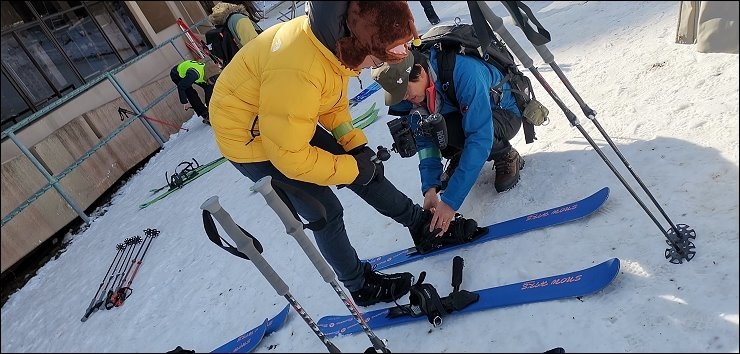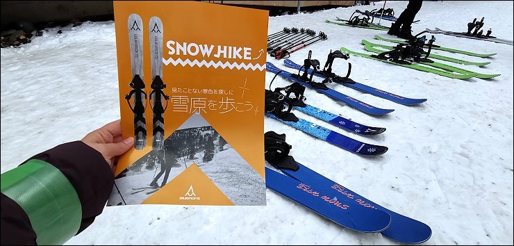 吃了海軍在吃的飯食之後,我們全身充滿力氣!來到我很期待的釜臥山滑雪場,幾年前我曾參加滑雪團到日本岩手滑雪,滑雪有分Ski或是Snow Board,Ski開始學比較容易,而Snow Board則是比較帥,初期比較難,聽說屁屁會摔的很慘@@滑了二天半Ski從基本功學起,怎麼穿脫裝備、剎車、怎麼跌倒、怎麼爬起來,到可以在雪地裡滑,讓我愛像小鳥乘著風在白色世界飛翔的快感!而這次來到釜臥山滑雪場我們體驗Snow Hike,它是類似SKI,但不需要換雪鞋,穿自己的鞋就可以,套上板子只要三分鐘就可以出發,不用像SKI或SB,光是換上鞋子上板子就要花我超多時間,Snow Hike的板底部有防滑,所以在雪地行走很OK!