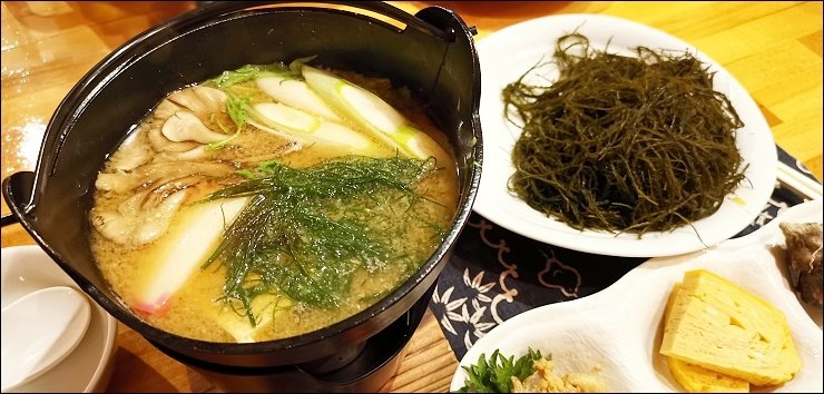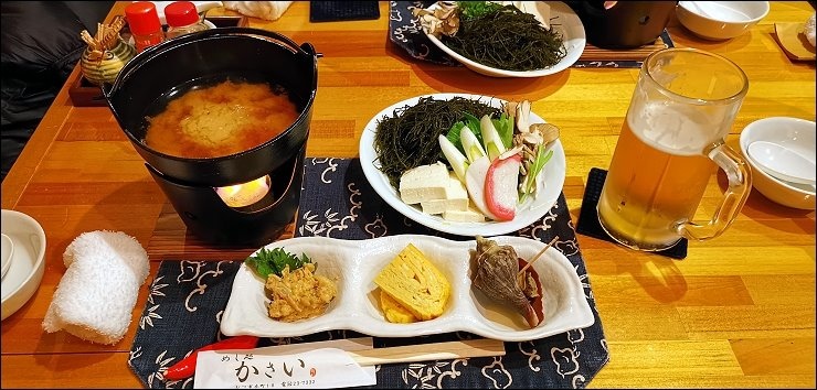 晚上來到むつ市區,晚餐在めし処かさい用餐,這裡的特色就是下北半島出產的松藻鍋,松藻是海藻類的一種,一般都是吃到是風乾後的海藻再加入湯裡煮,這裡則是新鮮的松藻,一大盤松藻自己煮,在味噌湯頭稍微涮幾秒,深色的海澡立刻變成青綠色,口感滑順帶點脆度,豆腐、大蔥及菇類,在味噌湯頭煮透了很是美味,配著小菜及甜甜的玉子燒,大夥喝生啤邊吃邊聊好熱鬧!