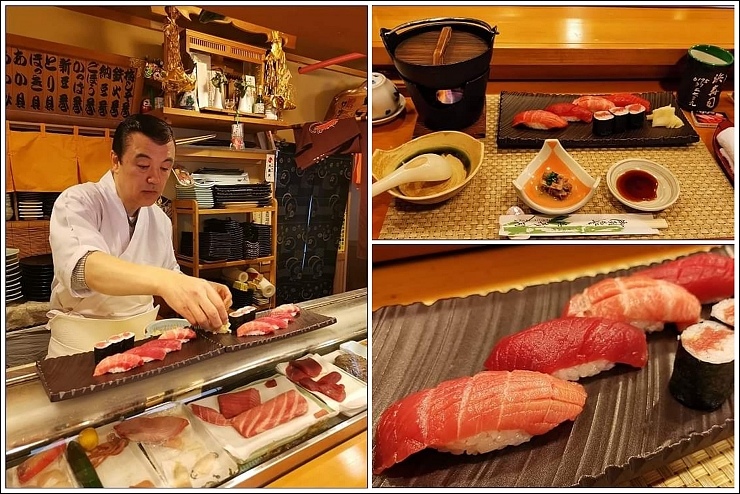 剛才的鮑魚關東煮只是讓我們塞牙縫,來到大間當然要品嚐厲害的大間黑鮪魚!!來到大間町浜寿司,自1964年開店以來,持續提供重量超過100公斤以上的頂級黑鮪魚。每年 9 月、10 月產季時,店主會花下大筆資金採購足以應付一年分的黑鮪魚,並將黑鮪魚最極致的各部位,急速冷凍保存在攝氏負 80 度的冰櫃,所以不管什麼時候來這裡,都能嚐到水準以上的最佳口感!黑鮪魚價格不低,但在這裡價位實在,在這裡吃黑鮪魚握壽司料理套餐,在別的地方可能只能吃到三貫@@黑鮪魚的口感相當細緻,入口時不會覺得生魚片很冷,魚肉一入口很快就化開了,沒有魚腥味,搭配軟Q的日本白飯,鮪魚握壽司壽司真是一絕,我最愛油脂滿滿的黑鮪魚大腹入口即化,另外,鮪魚稀少部位的眼睛周圍充滿大量膠原蛋白放入湯裡煮,吃完覺得自己年輕十歲,超滿足。