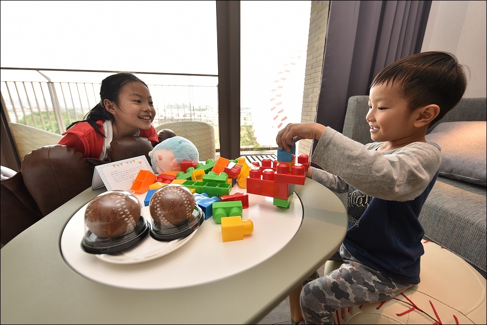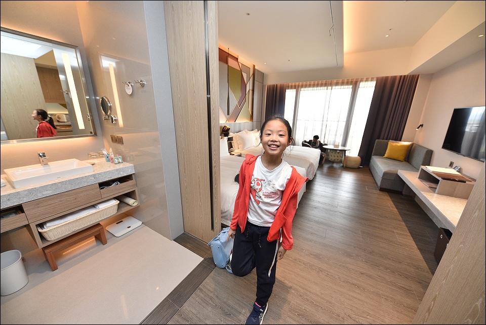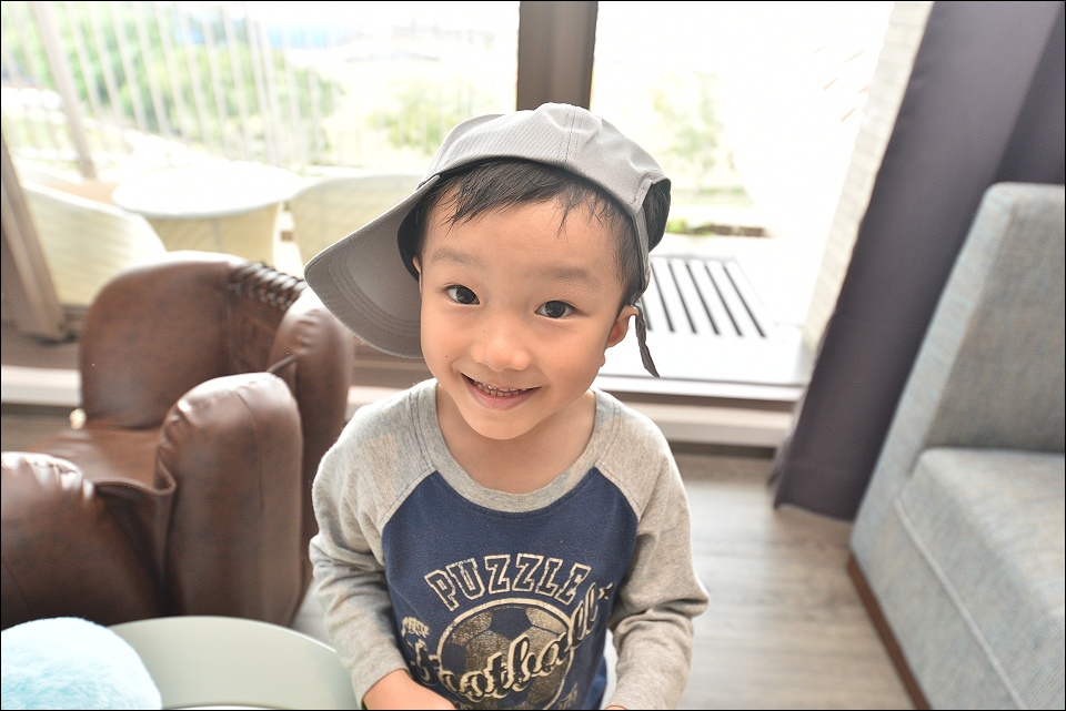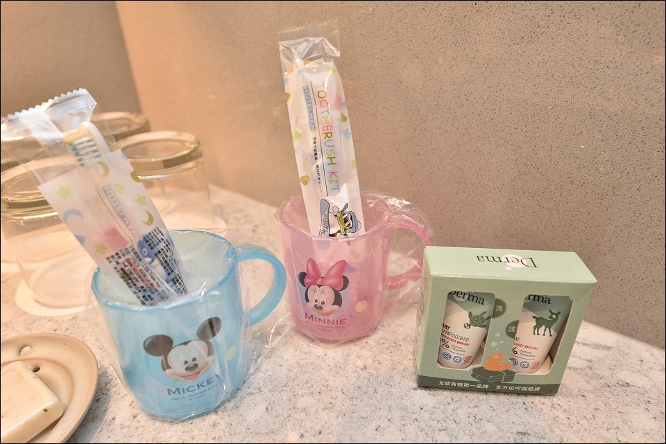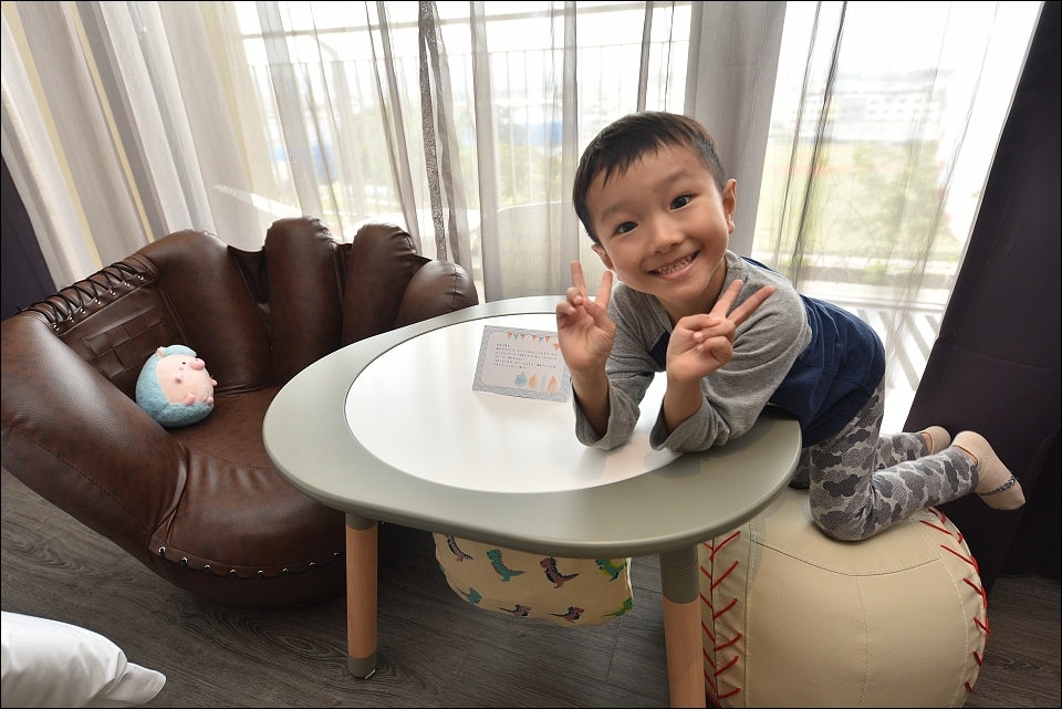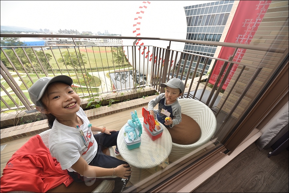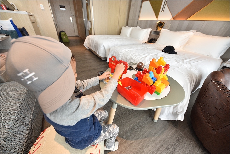我們之前入住的是棒球經典家庭房,野馬妹和阿弟仔進房看到棒球帽和棒球桌椅就一整個大興奮,發現桌下的積木又再尖叫好幾聲XD,備品感覺用很好,提供兒童拖鞋和牙膏,雙人床正常SIZE,不大但很好睡,躺上去就不想起來,一覺到天亮!