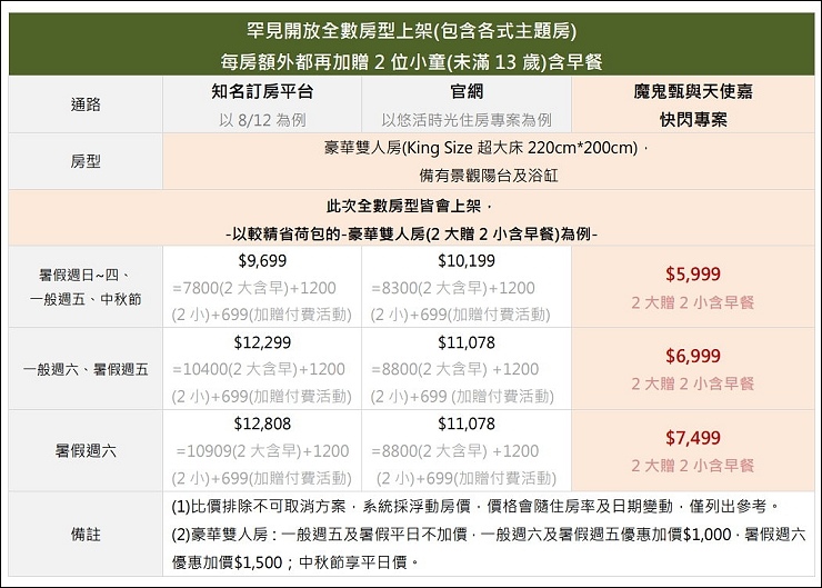 ✔️豪華雙人房一般週五及暑假平日不加價(現省$1000),暑假週六只加$1,500,中秋節更優惠平日價。
