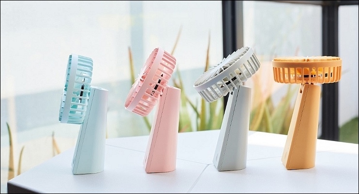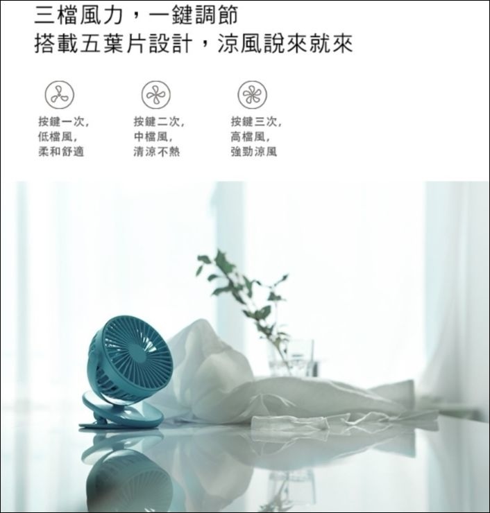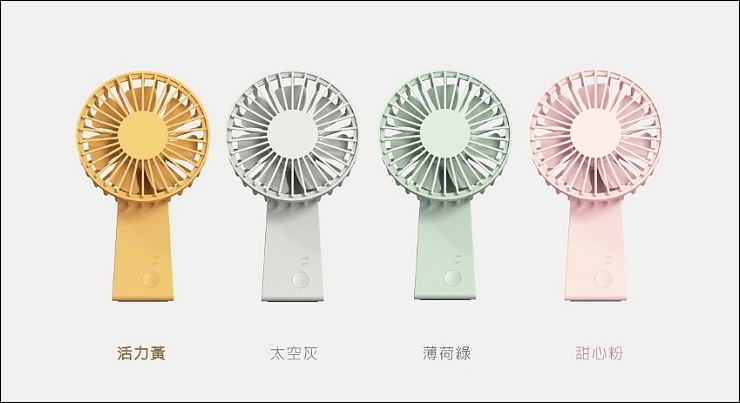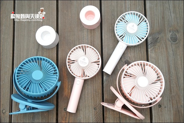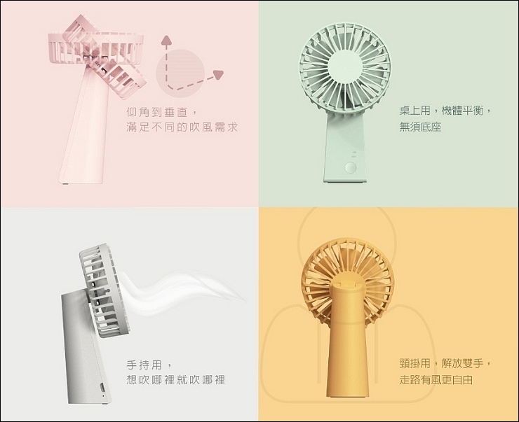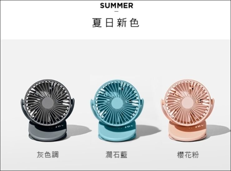 共有三色,櫻花粉/澗石藍/灰色調,我覺得它最厲害的是可以360度旋轉(不論上下或左右),等於各種角度都可以送風到達,克服任何環境。