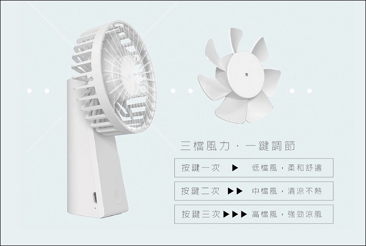 盒裝內另附固定底座及充電線,共三段風力,如果在室內擔心影響到別人,可以調整成低風速,聲音很小也涼快呦。