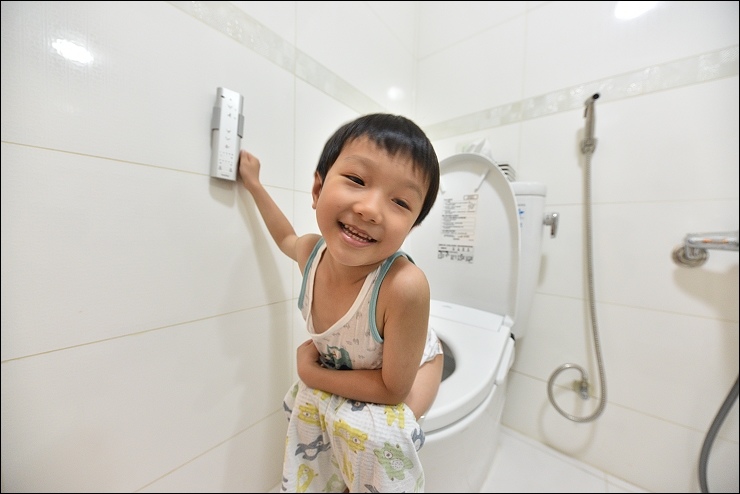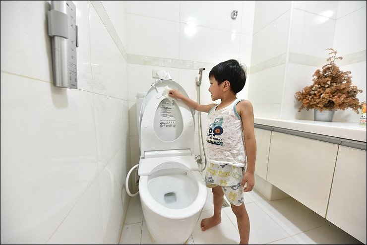 這小子手指按一按就有溫水洗淨便座的溫水服務,溫柔又舒服的沖洗他柔嫩的小屁屁,一臉舒服在享受!這便座是可以調整溫度,不止屁屁接觸的下蓋是溫的,連上蓋也是保溫材質,熱能不易散失,這在冷吱吱的冬天會特別有感,我超不喜歡一坐上便座是冰涼的感覺,連夏天也不愛,就是喜歡坐上便座是溫暖舒適的觸感,大家不要以為這樣很浪費電,其實TOTO的智慧省電功能更環保節能,加上省電設計一點都不浪費電!