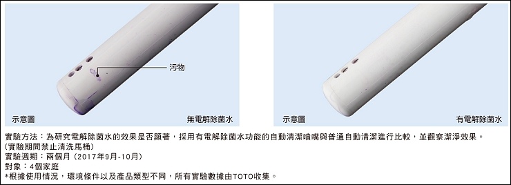 有些朋友會有噴嘴清潔問題的疑慮,而且TOTO WASHLET溫水洗淨便座有雙重清潔,在啟動WASHLET溫水洗淨之前,噴嘴會自動清洗,消除髒污疑慮,使用完畢後,噴嘴會再次清潔,不讓髒污殘留。TOTO為了追求更耐久的抗污效果,TOTO抗污白晶噴嘴採用創新抗污物質,撥水性更持久,無論使用多少次,污垢均不易沾黏,簡單沖洗或擦拭即可輕鬆維持潔淨,加上TOTO進階款溫水洗淨便座(型號TCF4931T)有電解除菌水技術,經TOTO實驗採用有電解除菌水功能的自動清潔噴嘴與普通自動清潔來比較,電解除菌水有顯著的潔淨效果,讓馬桶潔淨更持久,使用起來更潔淨更安心!