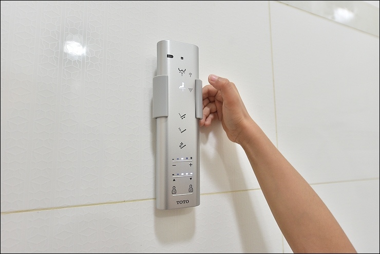 主要使用是正面的觸控面板,使用上看個人習慣,可以拿下來操作,或是像我家習慣直接掛在牆邊,上完廁所只要手指按一按,就能有溫水洗淨服務,也可以直接設定二組個人偏好的水勢、洗淨位置及溫水溫度,當然設我們母子二人剛剛好!