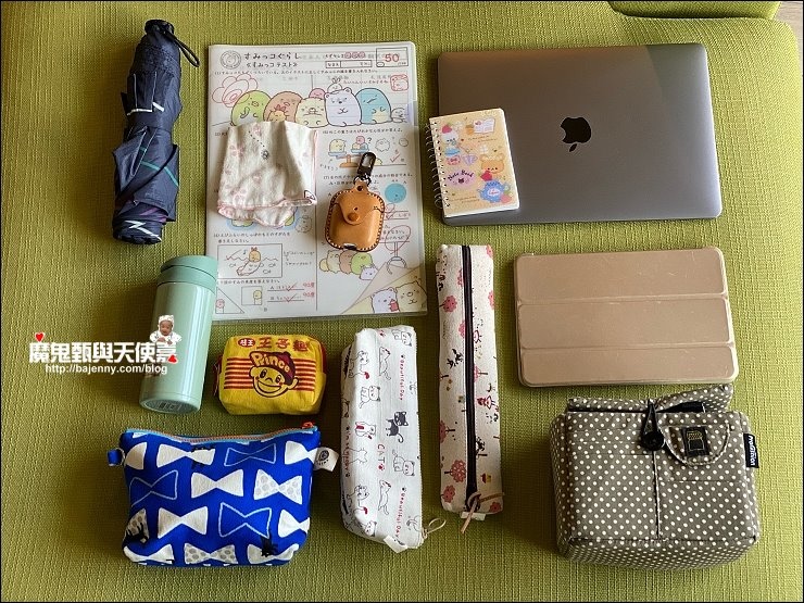 夏天出門還有小風扇、保溫瓶、晴雨傘通通都要記得!!因為在進修日文,所以還有書本、筆袋跟筆記本這些,旅遊的時候,環保筷套也很重要。