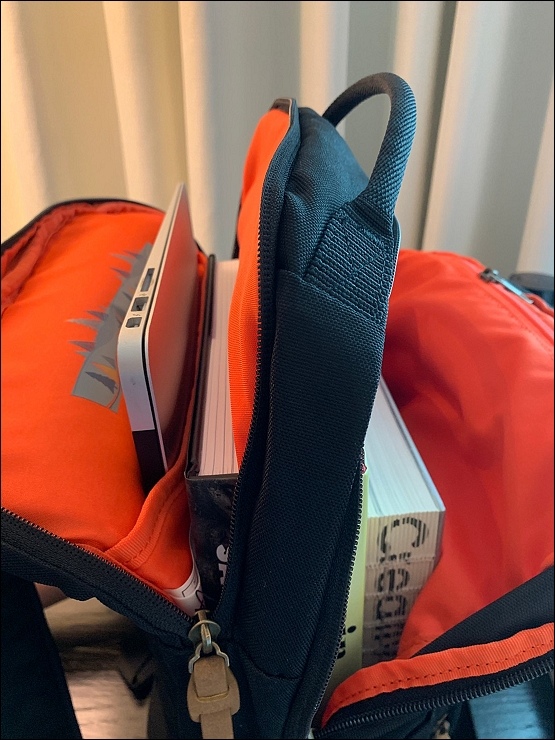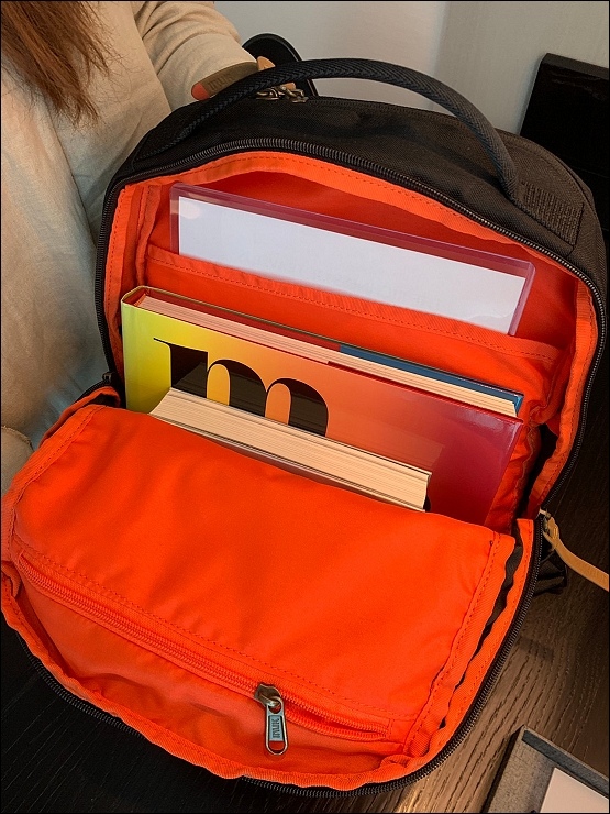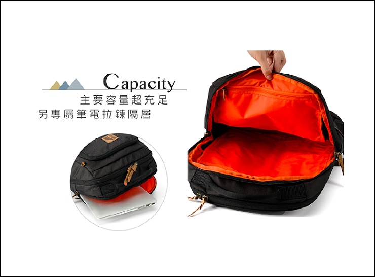 背包的內裡都是橘色/傳達活力正向的概念,裡面的內裝全都露,這咖容量沒電腦包那麼大喔!主要定位在城市游走、短距離的旅行或工作。
