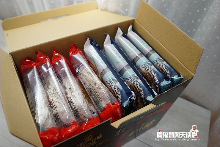 團購是以箱計,一箱16包,四種口味,可以選綜合、雙拼或任選,我個人最喜歡牛肉跟麻醬這兩種口味。