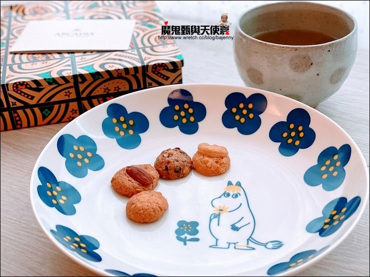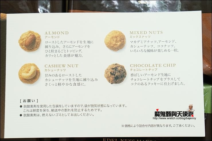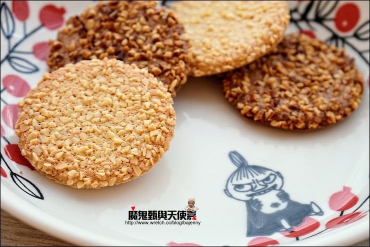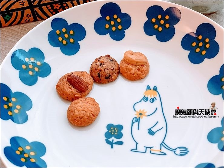 四格內容物分別是:杏仁、腰果、混合堅果、巧克力片,小小一個很解饞,尤其年紀大了,知道堅果對身體的好處,吃這種餅乾罪惡感會比較小一點XD