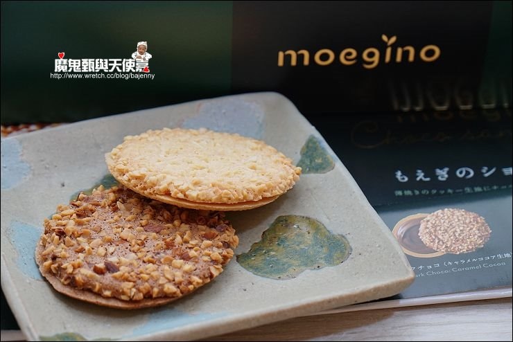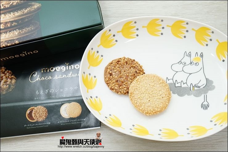 堅果烤巧克力三明治餅乾,表面烤巧克力裹上酥脆的堅果,製作成黑巧克力與白巧克力二種口味。