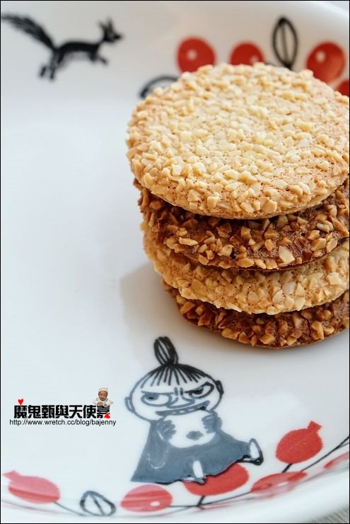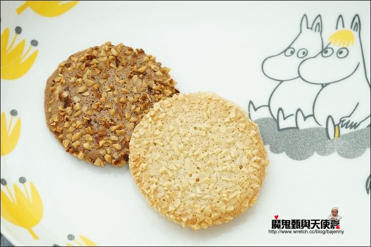 好姐妹喜歡白巧克力,她說餅乾不像感覺來的硬,而是脆口,我倒是覺得有種在吃口感更細緻高級、另類版酥鬆脆杏仁片夾心的fu~~